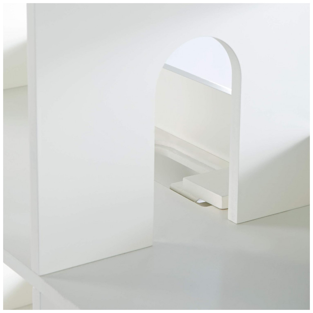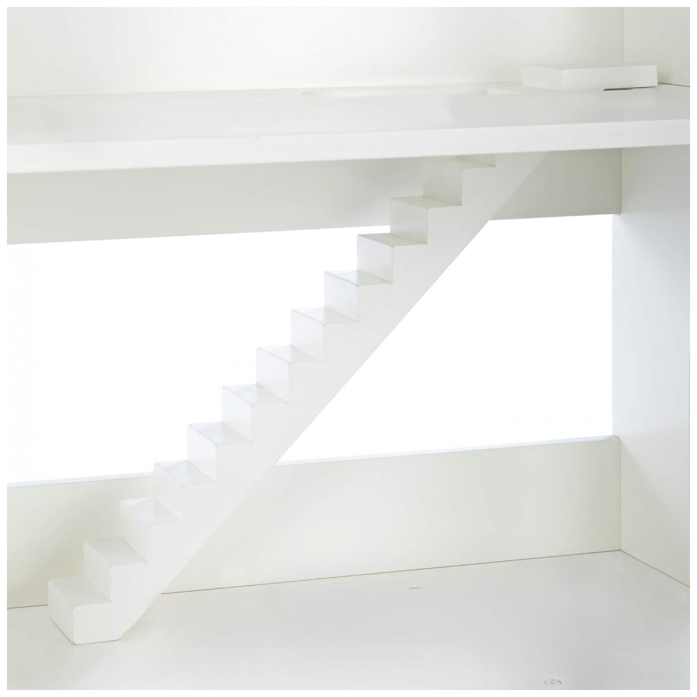 A estante casa de bonecas Martha Stewart Kids Deluxe Dollhouse Bookcase em Linen White foi desenvolvida para combinar armazenamento de livros e brinquedos com um formato lúdico de casa de bonecas em escala infantil. A estrutura em madeira de bétula e madeira engenheirada possui telhado inclinado, recortes de portas e janelas e escada removível, permitindo usar os compartimentos tanto como prateleiras quanto como “cômodos” para brincadeiras com bonecas de até aproximadamente 40cm de altura.