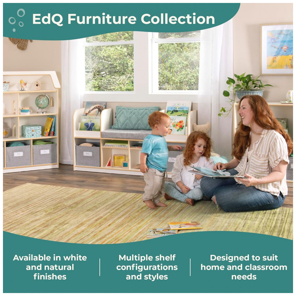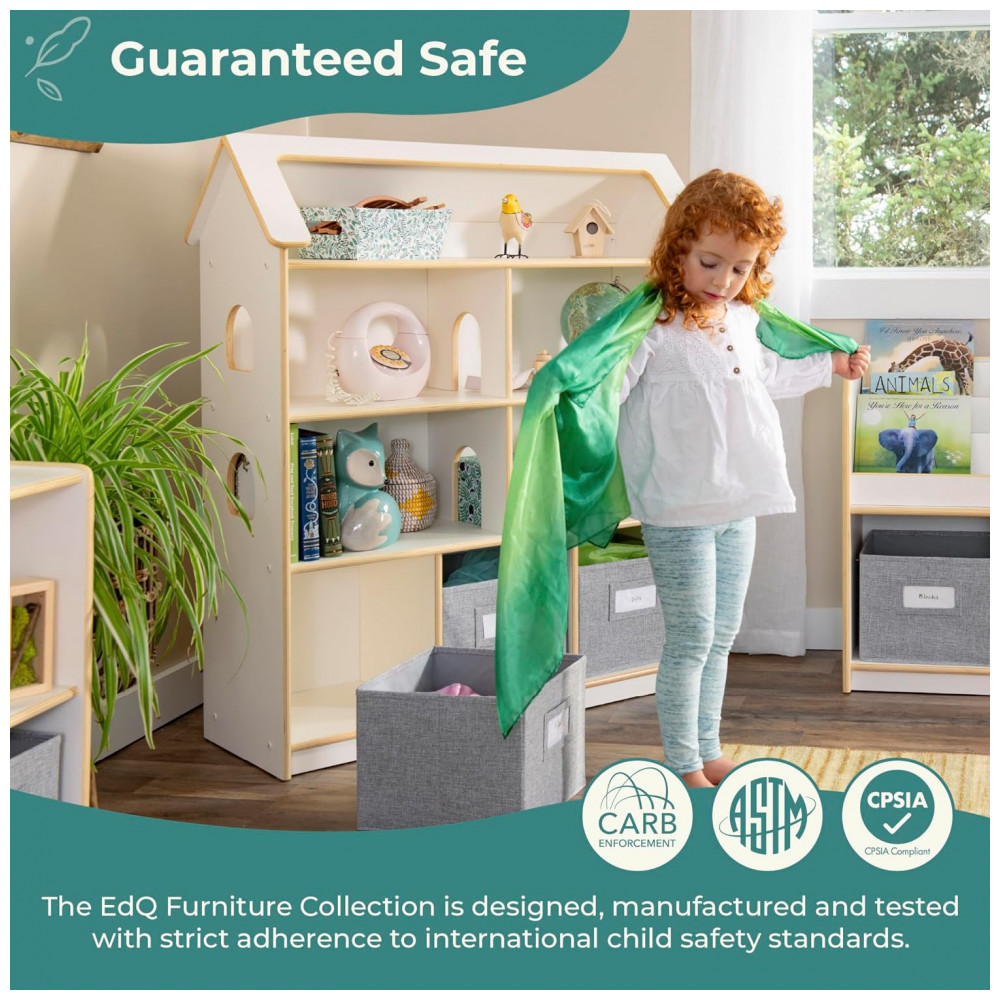 A linha EdQ da Guidecraft foi criada para integrar soluções de organização e mobiliário lúdico em ambientes infantis, unindo formas temáticas, como casinhas, a funções de estante e armazenamento. A Guidecraft atua há décadas em mobiliário infantil e brinquedos educativos, priorizando uso de compensado de bétula durável, segurança e produtos que promovem autonomia e brincadeiras imaginativas.