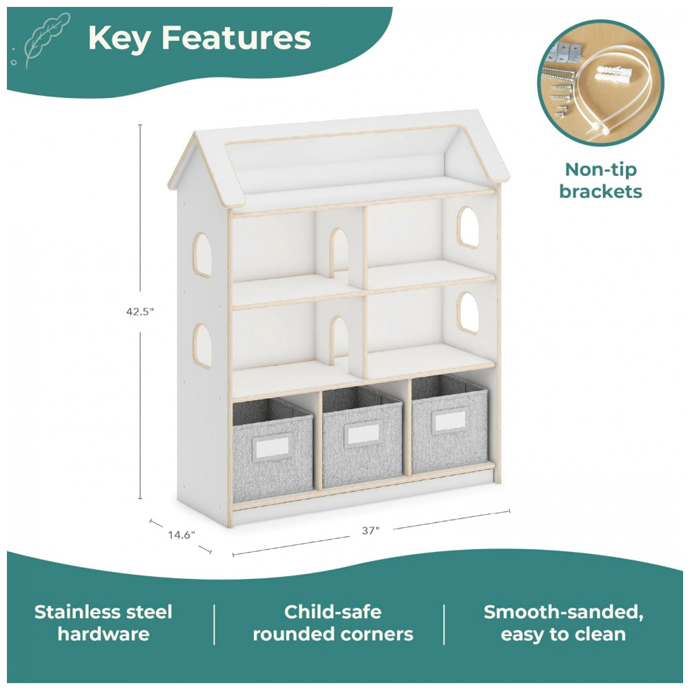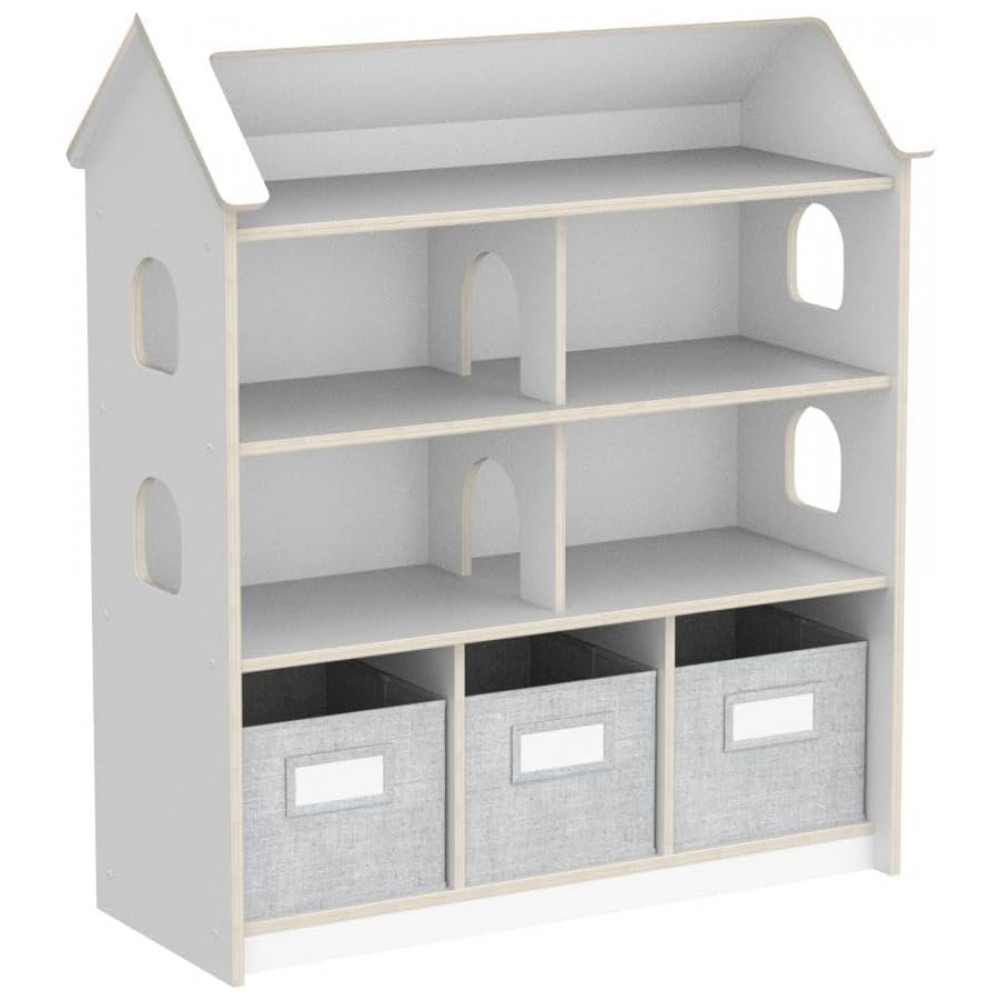 Estante casinha infantil Guidecraft EdQ Dollhouse Bookcase Branca com prateleiras e 3 caixas de tecido 94cm