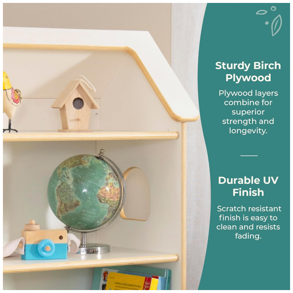 A estrutura é produzida em compensado de bétula com acabamento branco de fácil limpeza e bordas arredondadas, apropriada para uso diário em contextos com crianças. Os níveis internos são divididos em nichos e prateleiras abertas, oferecendo espaços de diferentes alturas para acomodar livros, bonecas, caixas organizadoras e elementos de cenografia em escala aproximada 1:12.