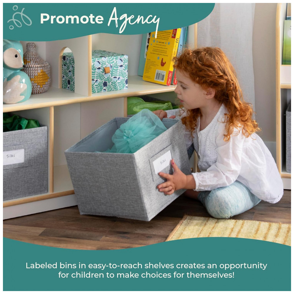 A base da estante inclui nichos compatíveis com três caixas de tecido inclusas, cada uma medindo cerca de 27,2cm de largura, 27,2cm de profundidade e 21,6cm de altura, ideais para guardar acessórios de bonecas, blocos, peças pequenas e materiais de arte. A combinação de prateleiras abertas e bins fechados ajuda a equilibrar exposição de livros e brinquedos com armazenamento discreto.