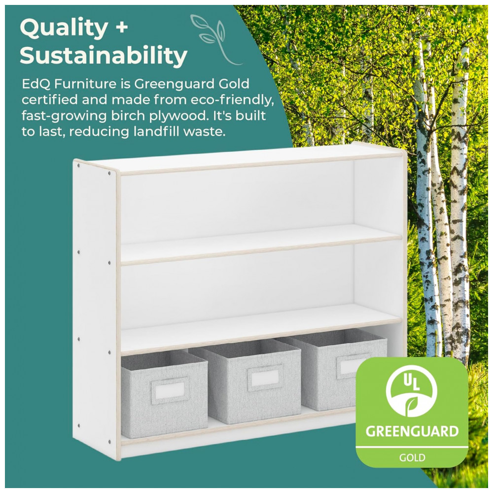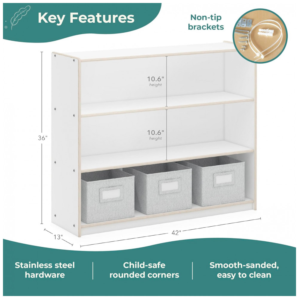 Estante infantil de piso com 3 prateleiras abertas e profundas, projetada para organização de livros, brinquedos e materiais pedagógicos em salas de aula, ambientes de homeschool e áreas de brincar. A estrutura retangular em compensado de bétula, com fundo fechado, acabamento branco de fácil limpeza e cantos arredondados, foi desenvolvida para uso frequente em contextos educacionais.