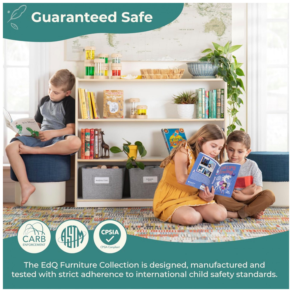 O móvel acompanha 3 caixas de tecido posicionadas em um dos níveis, permitindo armazenar itens menores e manter o conteúdo visualmente organizado. Com dimensões adequadas para crianças de 3 a 15 anos, a estante favorece o acesso autônomo aos materiais e integra a linha EdQ, pensada para espaços de aprendizagem que priorizam mobiliário funcional e resistente.