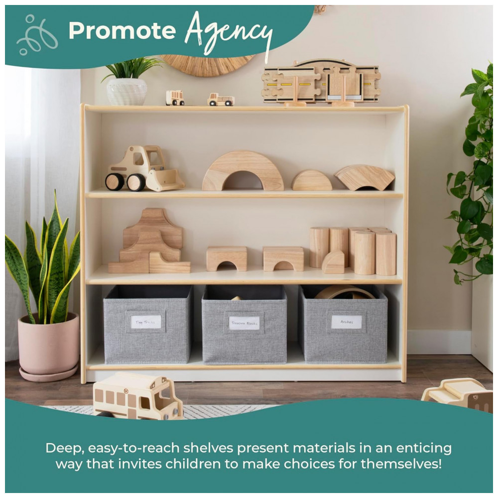 Estante infantil 3 prateleiras Guidecraft EdQ Branca com 3 caixas de tecido em madeira bétula 107cm