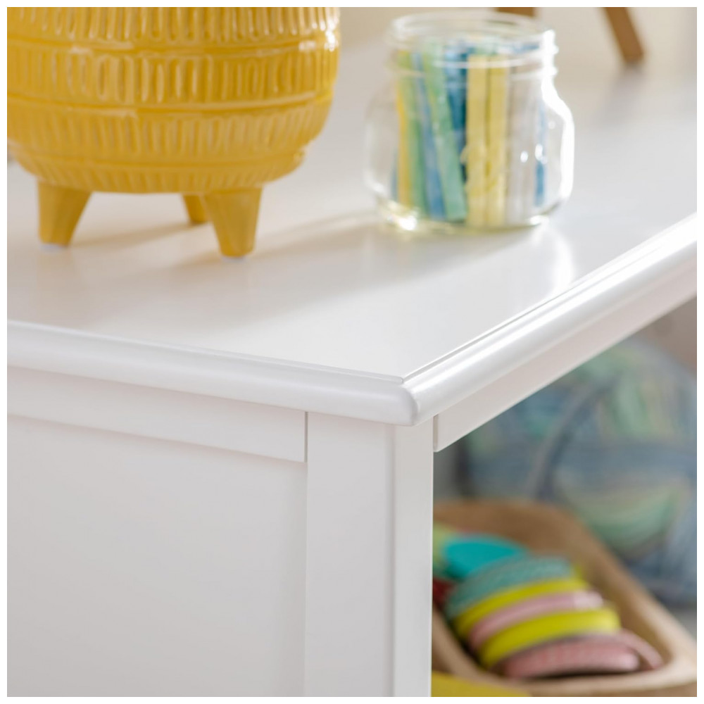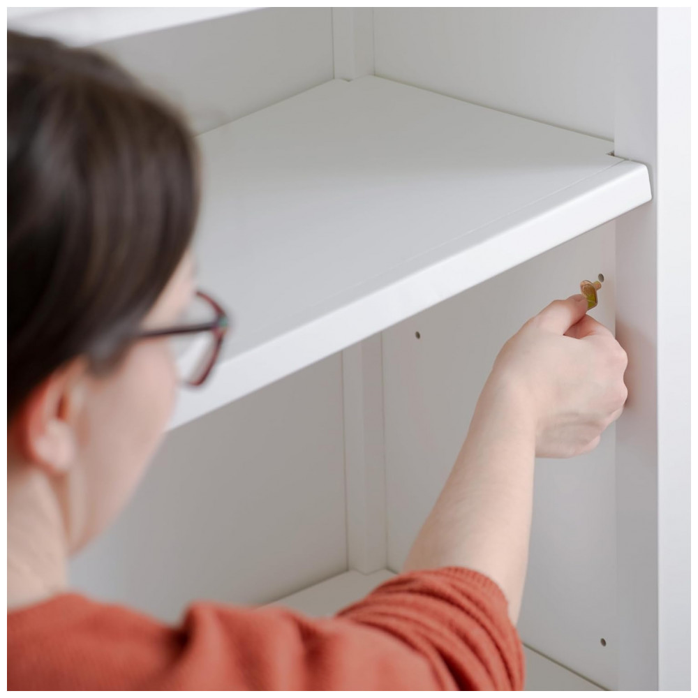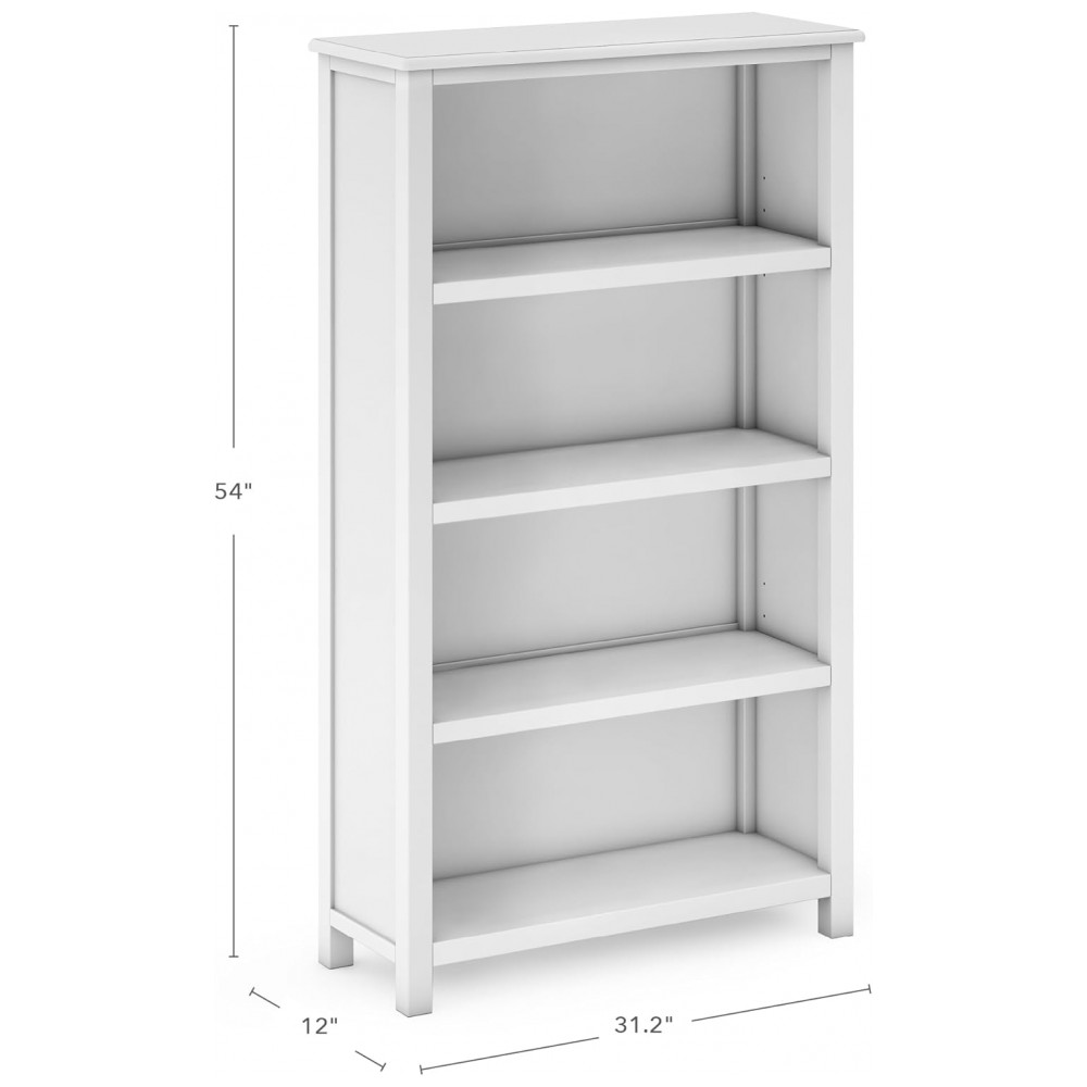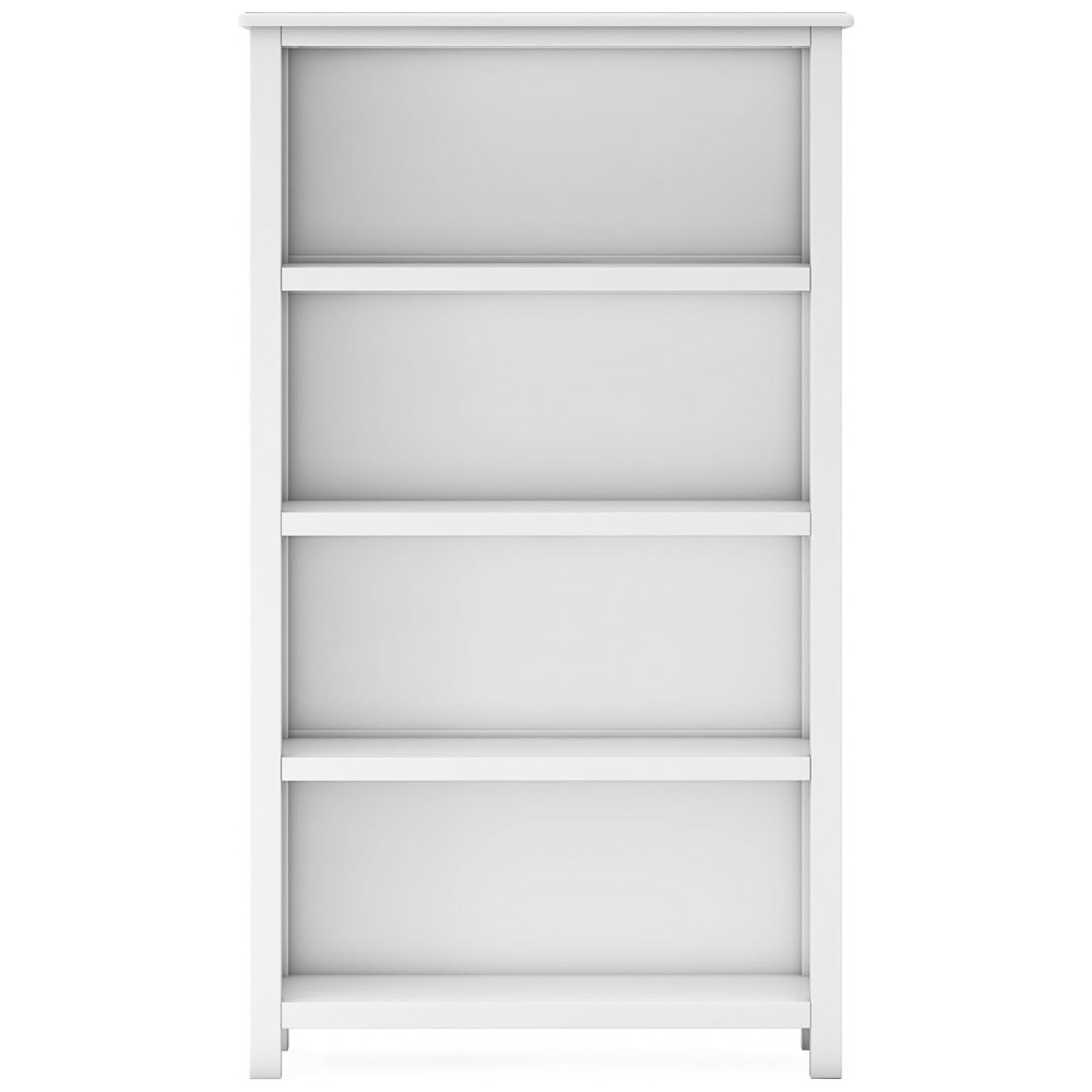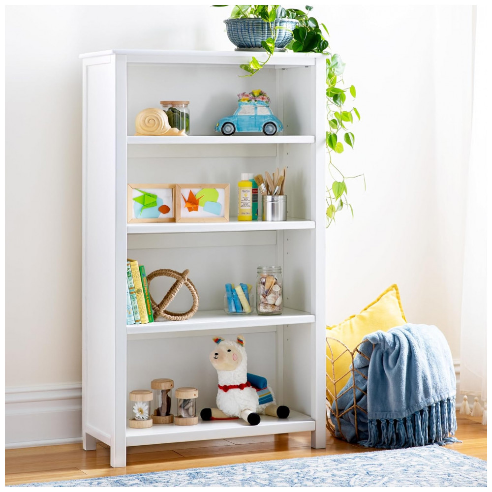 O móvel é fabricado em combinação de madeira maciça de pinus na estrutura com painéis em madeira engenheirada, em acabamento branco laqueado de fácil limpeza. As quatro prateleiras amplas e profundas acomodam livros em pé ou empilhados, caixas organizadoras e cestos, oferecendo espaço suficiente para articular materiais de arte, recursos pedagógicos e brinquedos em um único módulo vertical.