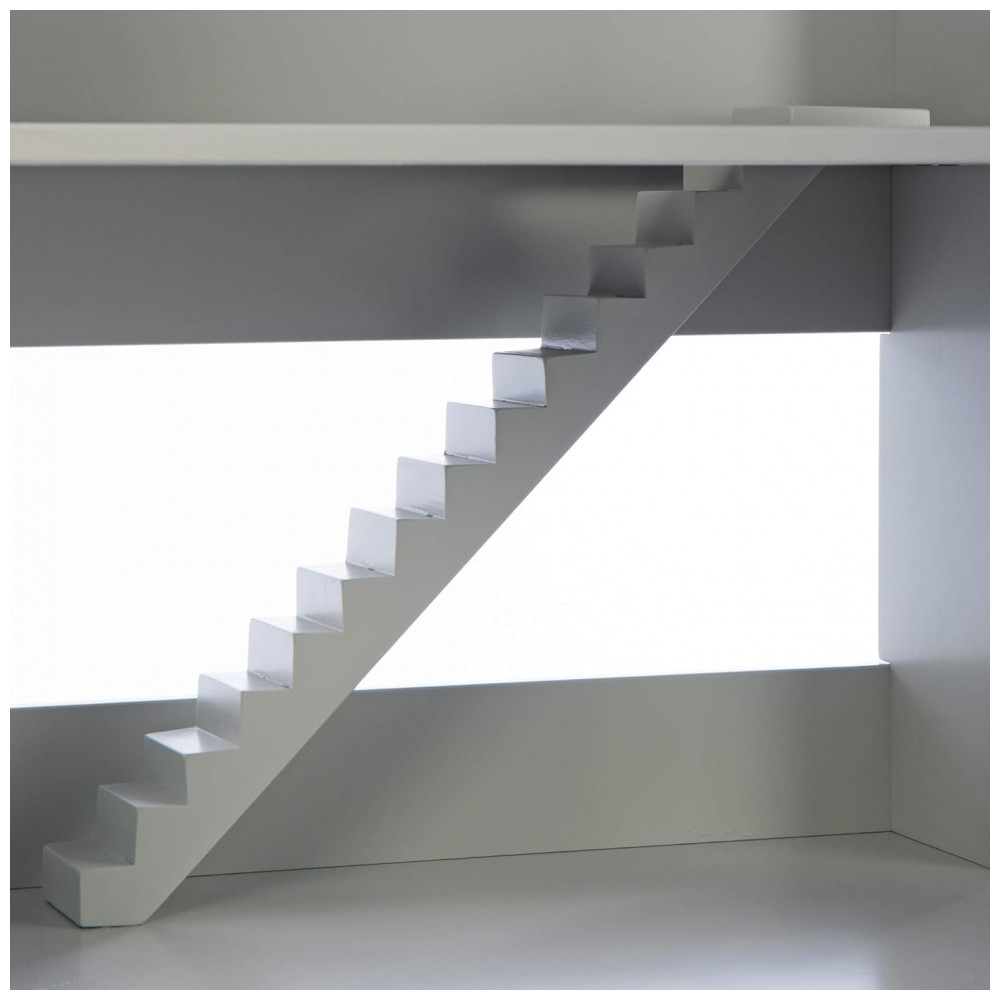 Conteúdo da caixa: 1 estante Martha Stewart Kids’ Deluxe Dollhouse Bookcase cinza em peças para montagem, 1 escada removível, 3 bins de tecido, ferragens e manual de montagem