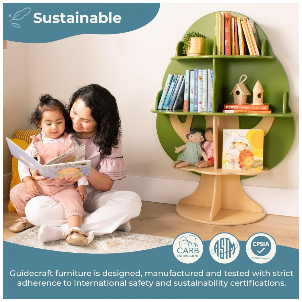 A Guidecraft tem longa atuação no desenvolvimento de mobiliário infantil e brinquedos educativos, com foco em madeira de qualidade, segurança e incentivo à autonomia. A proposta da Kids Tree Bookshelf alinha-se a princípios Montessori ao manter livros visíveis, acessíveis e organizados em uma estrutura convidativa e proporcional às crianças.