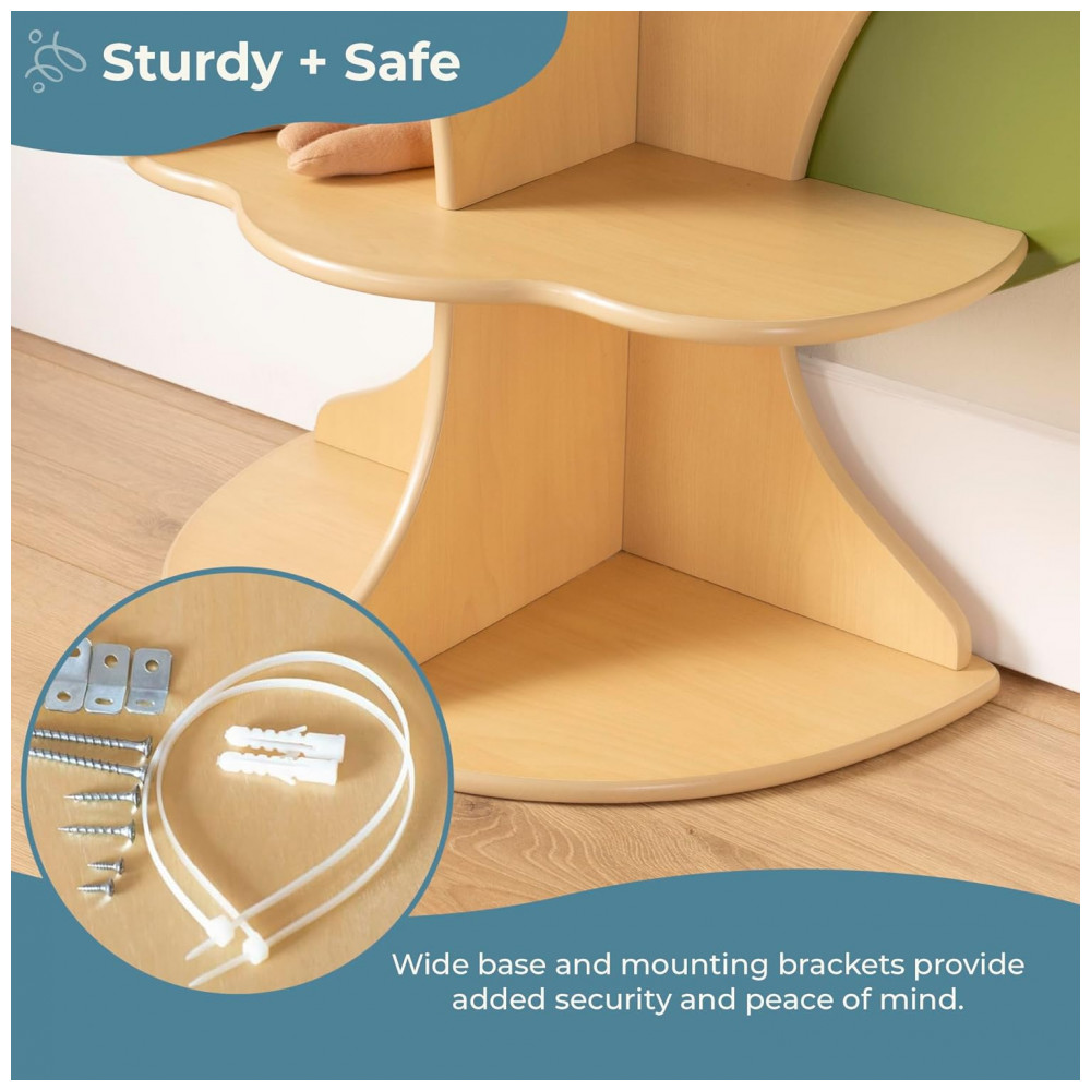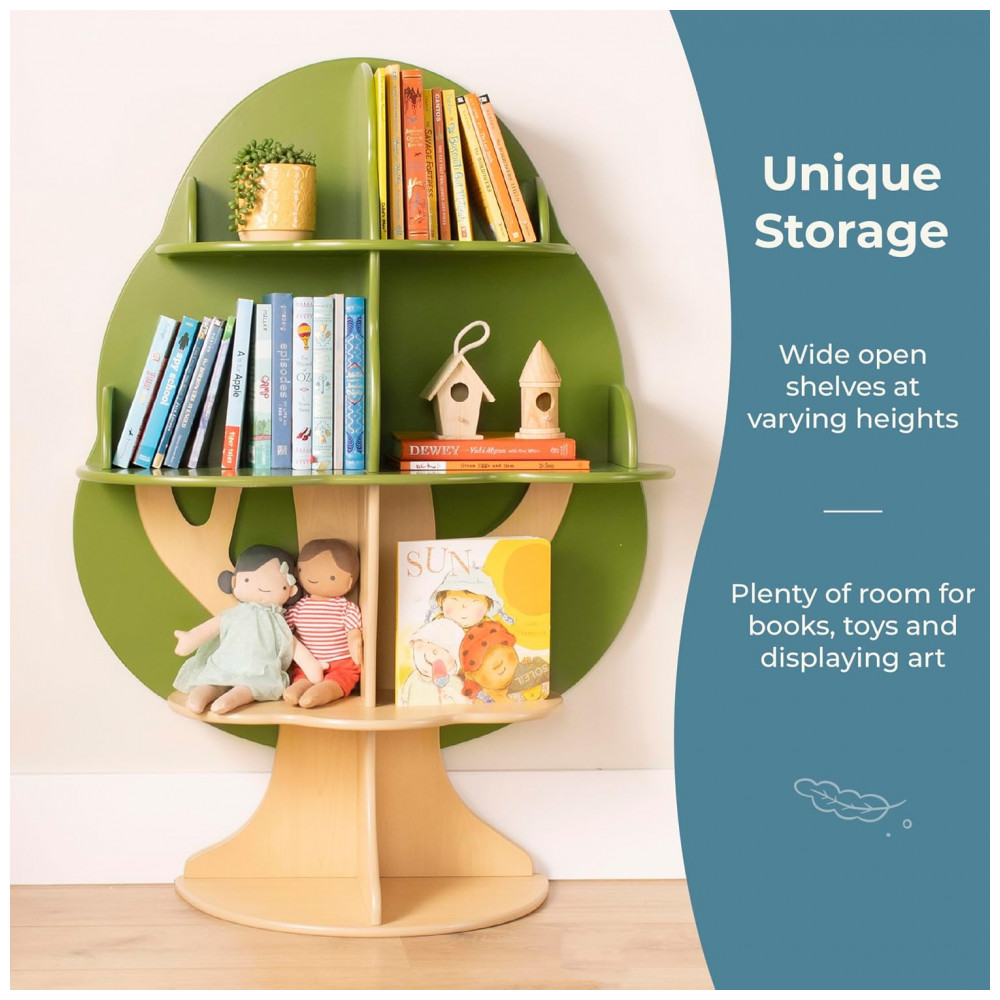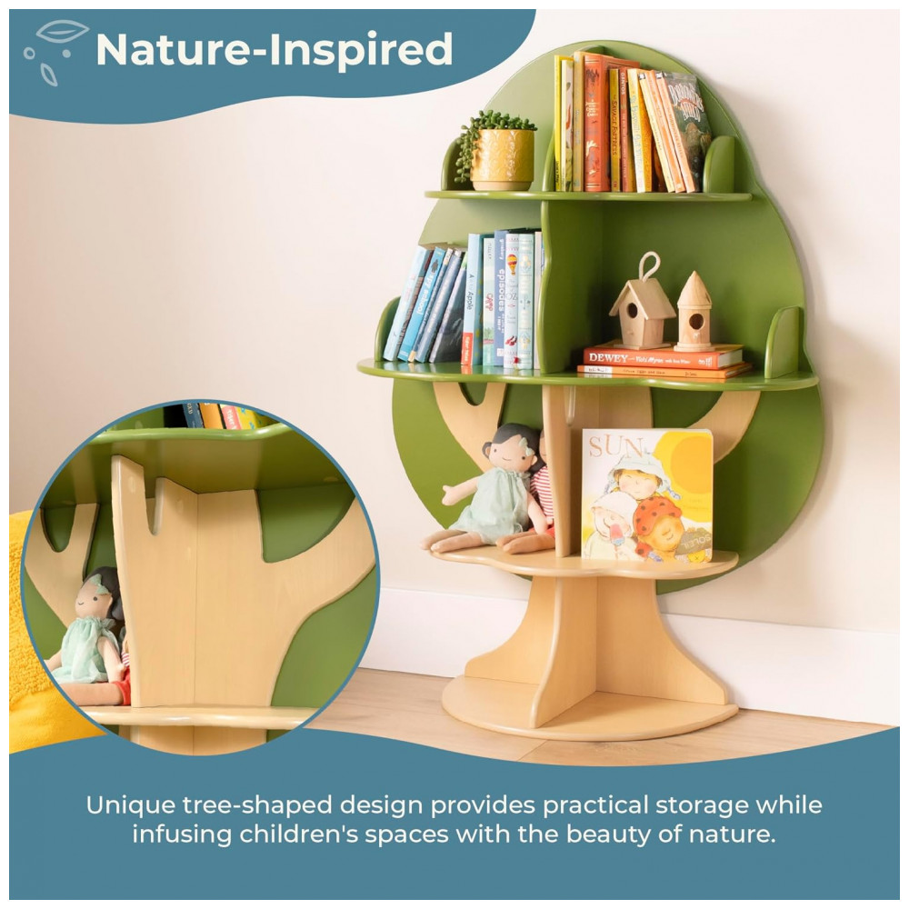 A estrutura é produzida em madeira engenheirada resistente, com cantos arredondados e superfície lisa de fácil limpeza, adequada para uso diário por crianças. O acabamento em tom de verde e o formato de árvore criam um ponto focal lúdico no ambiente, integrando decoração temática e solução funcional de armazenamento.