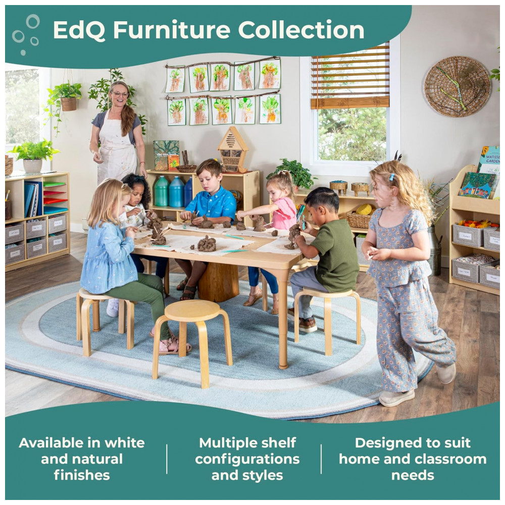 A Guidecraft desenvolveu a linha EdQ para atender necessidades de organização em contextos educacionais, com móveis modulares que podem ser combinados entre si. A marca tem trajetória consolidada em mobiliário infantil e brinquedos educativos, priorizando madeira de qualidade, segurança, durabilidade e desenho funcional para que as crianças possam escolher, guardar e reorganizar livros e brinquedos com autonomia.