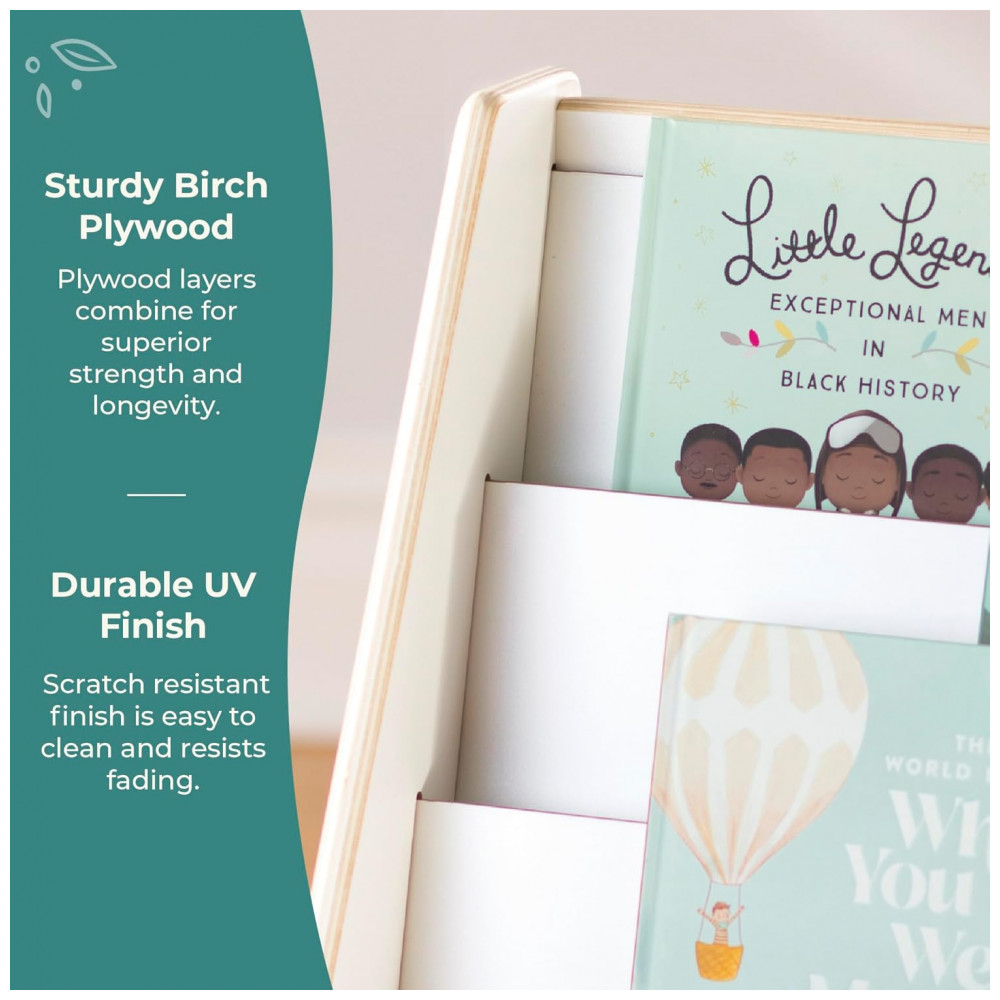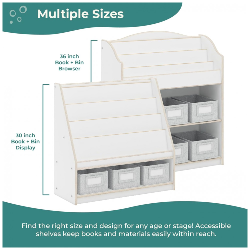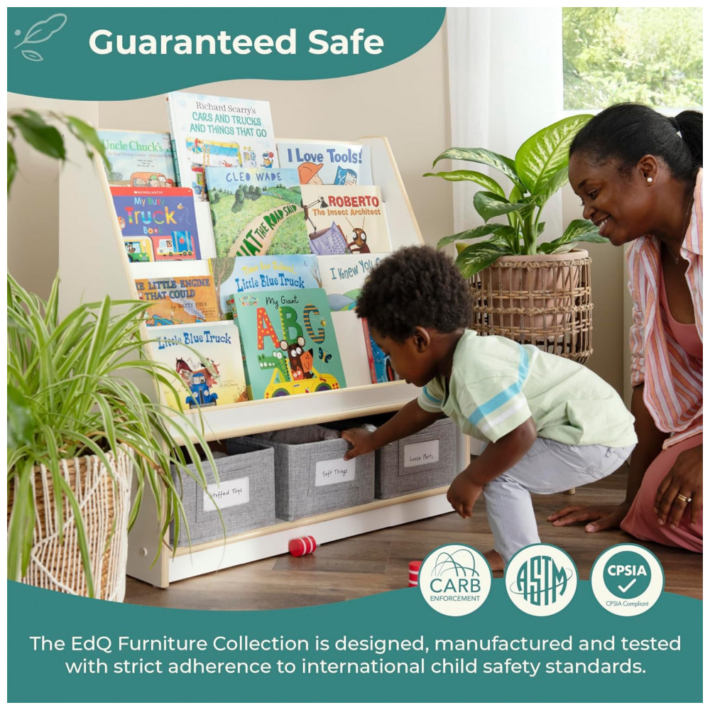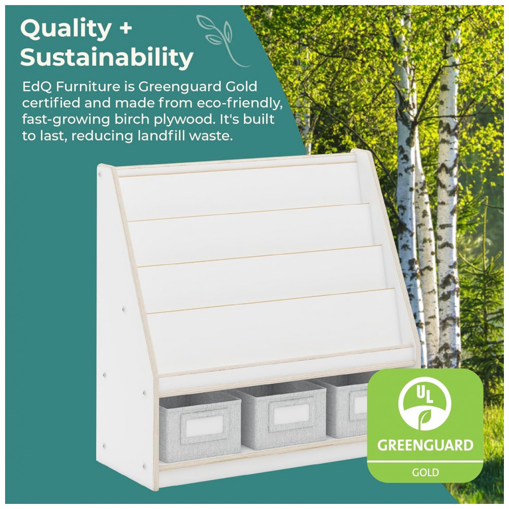 A Guidecraft EdQ Book and Bin Display branca é uma estante baixa infantil em madeira multilaminada de bétula, com acabamento de fácil limpeza e cantos arredondados, projetada para organizar livros, brinquedos e materiais em salas de aula, brinquedotecas e quartos infantis. A peça combina prateleiras superiores em níveis para exposição frontal de livros e uma prateleira inferior ampla que acomoda caixas de tecido para itens diversos.