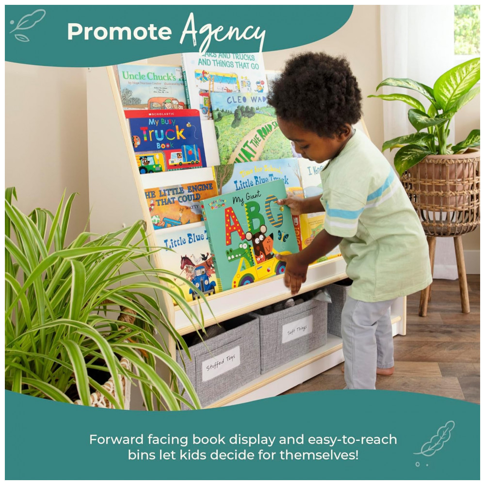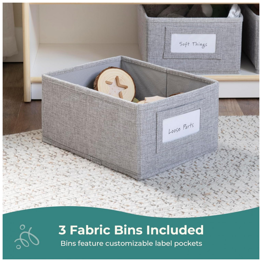 Estante infantil Guidecraft EdQ Book and Bin Display branca em madeira com prateleiras inclinadas e 3 caixas de tecido para livros e brinquedos