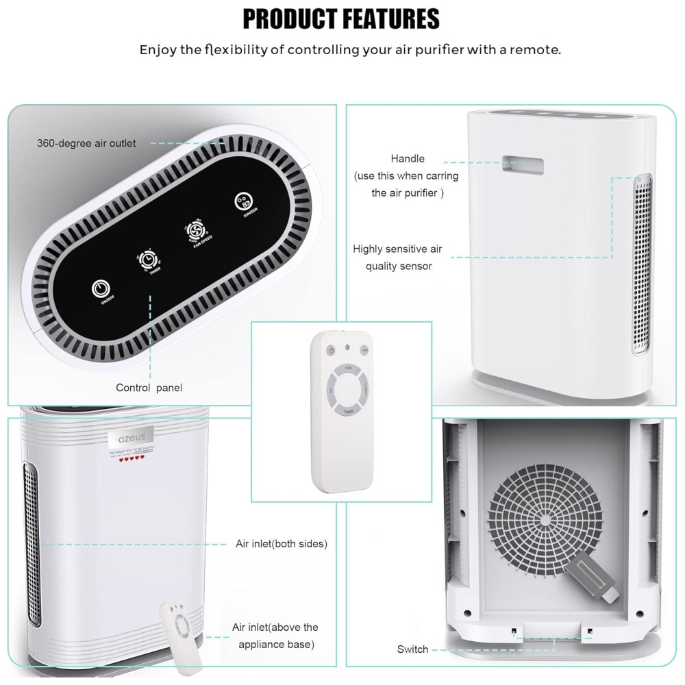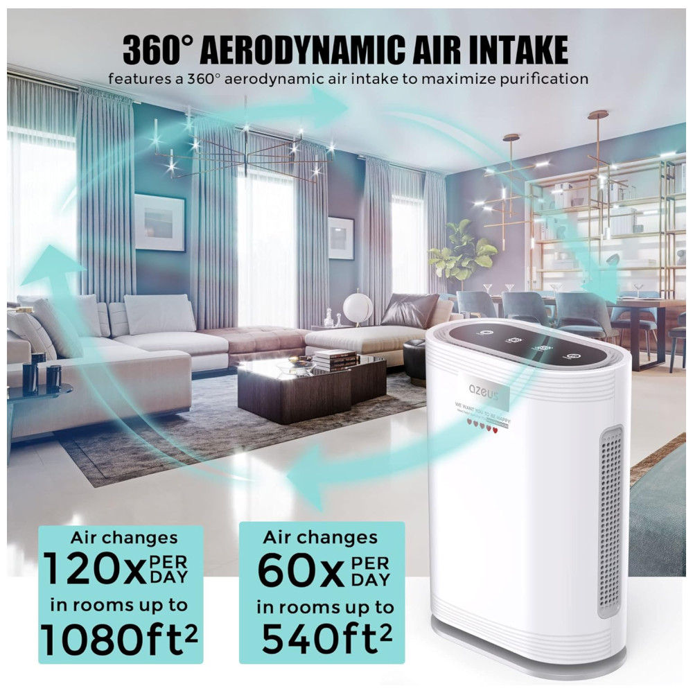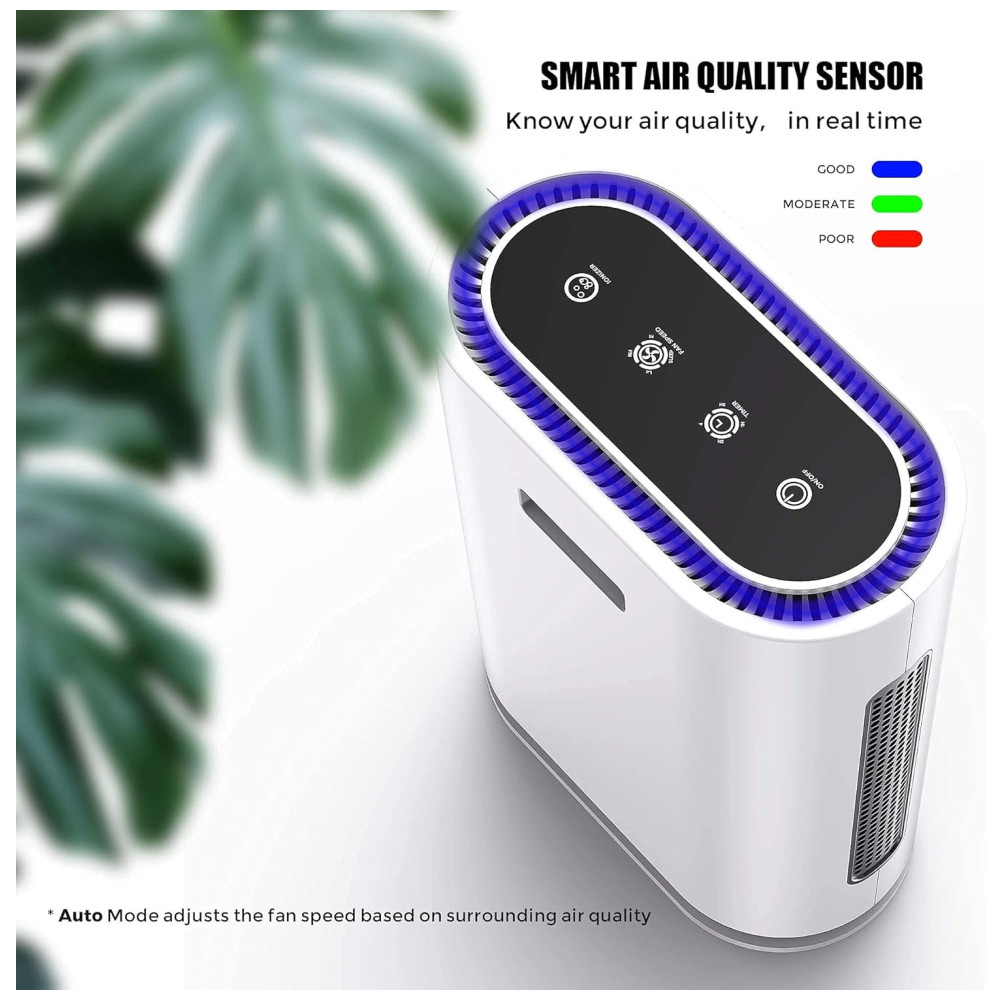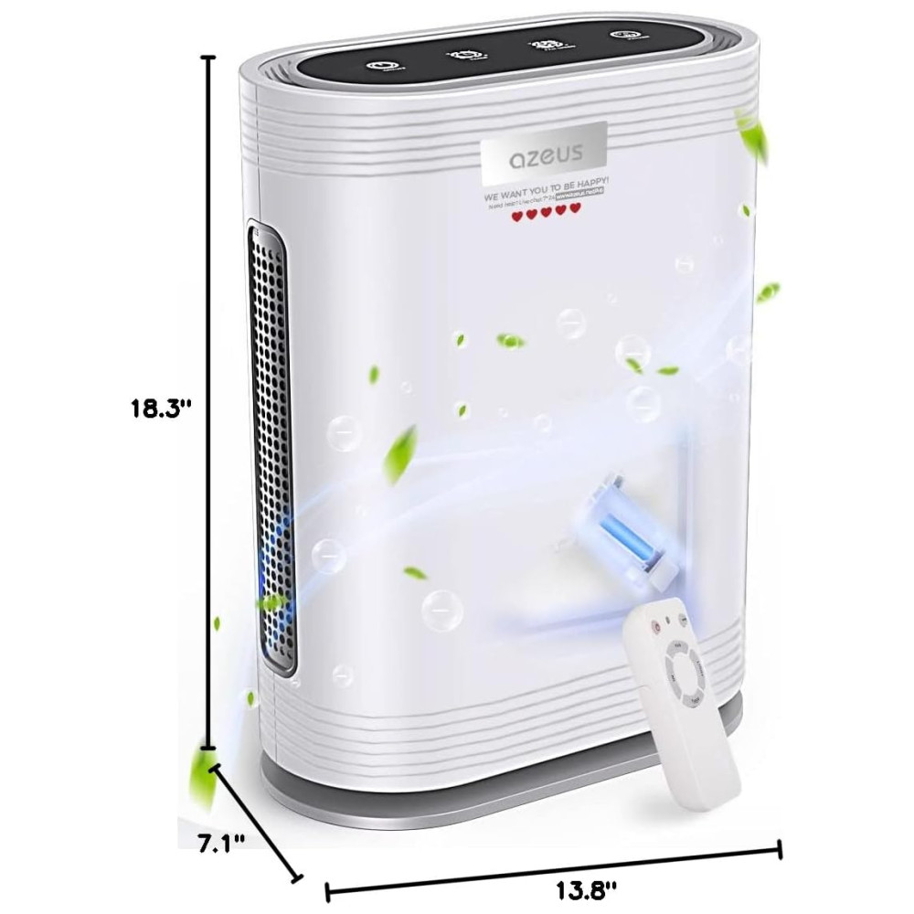 Aumentar um purificador de ar com luz UV em todo o local de trabalho será uma solução necessária. Com muitos restaurantes, salões, bibliotecas e outras empresas começando a reabrir. É necessário adicionar um purificador no local de trabalho. Os purificadores de ar AZEUS True HEPA com sistemas de desinfetante para luz UV C e ionizador são agora a opção número 1 para consumidores conscientes. Isso ocorre porque eles filtram o ar de poeira, alérgenos, pêlos de animais, fumaça, mofo e pólen. Operação silenciosa no modo de suspensão, o que é incrível para os quartos com um nível de ruído de 23 dB. Sensor de qualidade do ar automático no modo automático O purificador de ar AZEUS GL FS32 vem com um indicador inteligente de qualidade do ar ao vivo que mede e exibe alterações nos níveis de qualidade do ar com código de cores, como azul bom, verde moderado e vermelho ruim. . Saiba quando o seu ar está bom, moderado ou ruim e tenha a tranquilidade de que o seu purificador responde adequadamente. Detecta automaticamente a qualidade do ar, aumenta ou diminui a velocidade do ventilador para reduzir partículas ou odores. Luz noturna opcional As luzes diminuem, proporcionando um sono mais repousante. Respire fundo, pois agora você está experimentando um ambiente verdadeiramente pacífico. Para desligar a luz noturna, localize VELOCIDADE DO VENTILADOR MODO DORMIR 4 luzes brilhando no touchpad Pressione novamente, a luz noturna LED está apagada. Segurança de filtro pré instalado certificado pela CARB 100 para uso doméstico, certificado pela California Air Resources Board. Certificação ETL Certificação FCC Certificação CE Especificações e dicas de uso Fonte de alimentação AC 120V , 60Hz Produto pesa 5,6kg Direção do fluxo de ar Admissão de ar aerodinâmica em 360 graus 3 velocidades do ventilador modo de suspensão opcional Luz noturna timer Sensor de qualidade do ar automático no modo automático detecta a qualidade do ar e aumenta ou diminui a velocidade do ventilador Desinfetante de luz UV C ionizador opcional Economia de energia 19W modo de suspensão, 36W , 41W , 60W baixa , Médio , Alto Os filtros de substituição estão disponíveis para compra na , o filtro ASIN é apenas para uso interno B07ZTZGFQG. A luz UV está ligada por padrão e possui um ciclo de trabalho de 20, 10 minutos. Só pode ser desligado por controle remoto. Após cerca de 2.000 horas de operação, os quatro segmentos do indicador do timer acenderão para lembrá lo de substituir o filtro