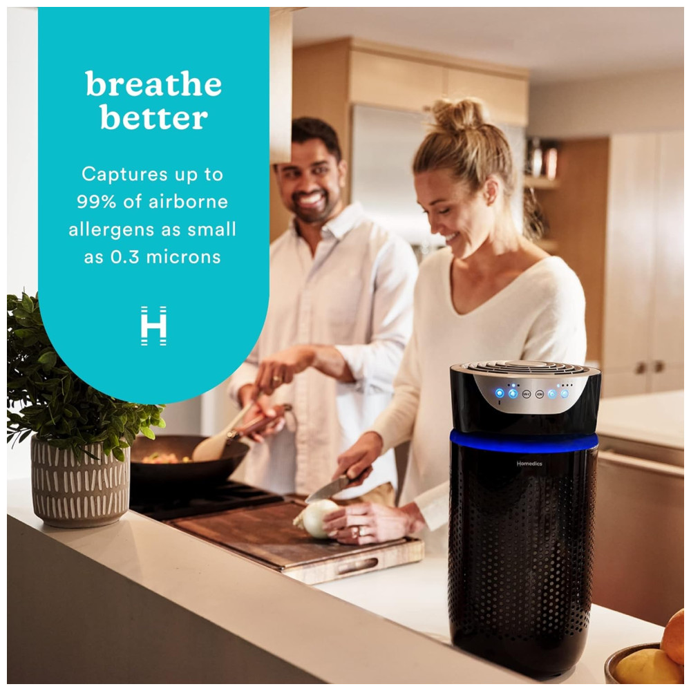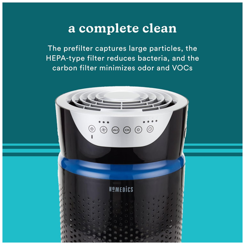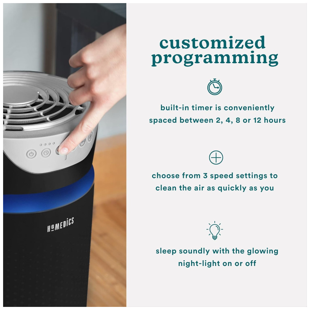 Sobre a HoMedics A HoMedics tem o compromisso de ajudá lo a criar um ambiente doméstico saudável para relaxar seu corpo, desestressar sua mente e simplificar sua vida. Fundada em 1987, somos um líder confiável em saúde e bem estar. Nossa marca é amplamente reconhecida por produtos de massagem em casa e continua a ser a principal inovadora em tecnologia de massagem. Além disso, possuímos uma linha completa de produtos de bem estar em casa, incluindo filtros de ar, umidificadores, máquinas de ruído branco, monitores de fitness, difusores de aroma e muito mais. Purificador de ar para salas grandes TotalClean 5 em 1 UV AP T40WT Pronto para levar o ambiente a um nível de limpeza Experimente um ar mais fresco com o purificador de ar torre grande sala 5 em 1 da HoMedics TotalClean. Ele captura até 99,97 dos contaminantes transportados pelo ar, proporcionando 360 graus de ar mais limpo e fresco para toda a família. O modelo AP T40 limpa o ar em salas de até 23 metros quadrados, removendo alérgenos, poeira, fumaça, esporos de fungos e germes. Filtragem 5 em 1 com tecnologia UV Clean O filtro HEPA remove 99,9 dos alérgenos tão pequenos quanto 0,3 mícrons. A higienização por UV C mata bactérias e vírus nocivos. Equipado com uma luz noturna, um timer de desligamento automático que permite escolher entre 2, 4, 6, 8 ou 12 horas significa que você pode configurá lo e esquecê lo sem problemas. Diga adeus a alérgenos, pólen, mofo e muito mais Um sistema de filtragem HEPA de 360 graus remove até 99,97 dos alérgenos no ar, tão pequenos quanto 0,3 mícrons. Ele também captura e remove pólen, poeira, fumaça, pêlos de animais, esporos de mofo e germes. A luz UV C também ajuda a matar germes, bactérias e vírus. Controles que você pode entender, os botões claros e facilmente rotulados, localizados na parte superior da unidade, permitem que você ligue o purificador com facilidade. Ajustar o temporizador é tão fácil quanto pressionar um botão. Para alterar a hora, basta pressionar e ver o indicador acima do botão do temporizador acender próximo ao incremento de tempo correto que você deseja definir. AP T20 AP 0 AP DT10 AT PET02 99,97 efetivo 99,90 UV C mata até 99,97 de bactérias e vírus. Filtros Filtro tudo em um Pre, carbono e Hepa substituem apenas uma vez por ano Oscilação Filtragem exclusiva de odores PetPlus Cobertura da sala Filtragem de 360 graus, qualidade do ar, sensor de partículas, sensor Automático Modo automático Slot de óleo essencial de luz noturna com 3 almofadas