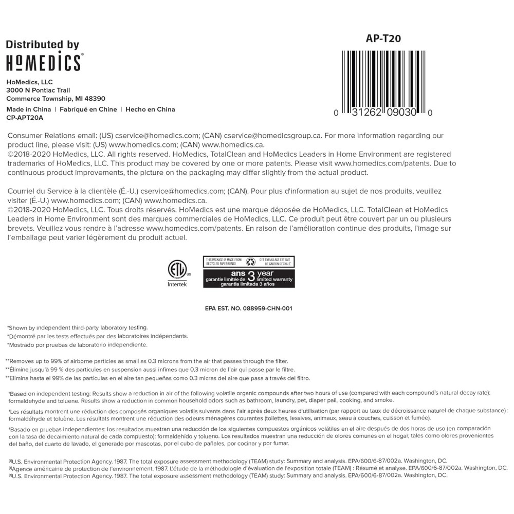 Cor:Preto; Voltagem:110v; Marca:Homedics; Modelo:AP-T20; Condição do item:Novo;
