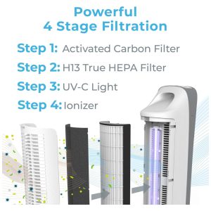 Purificador de ar torre PureZone Elite 4 em 1 Potência 120V, 60Hz, 60W Peso 4,2kg CADR e fluxo de ar 120 CFM Ruído 60,2 dBA. Tecnologia de filtragem de ar em quatro estágios. O PureZone Elite retém e destrói 99,97 de partículas tão pequenas quanto 0,03 mícrons. Desfrute de uma melhor qualidade do ar, pois o filtro de 4 estágios premium limpa e higieniza o ar com segurança. Retire poeira, pólen e pêlos de animais Reduza os odores da cozinha e elimine a fumaça Ótimo para a estação das alergias e o ar purificado durante todo o ano, ótimo para qualquer ambiente. O PureZone filtra o ar de maneira eficaz em grandes salas ou escritórios. Cobrir com eficiência salas de até 18 metros quadrados, taxa de fornecimento de ar limpo de 120 CFM Ideal para quartos, salas de estar e escritórios. Tecnologia inteligente, o PureZone Elite está completo com um indicador de redefinição de filtro para ajudar a manter o purificador de ar funcionando da maneira mais eficiente. O filtro de reposição inclui pré filtro de carvão ativado e filtro True HEPA, o filtro de longa duração dura até 6 meses, o temporizador opcional ajuda a preservar a longevidade do seu filtro com tempos de execução predefinidos. Certifique se de comprar apenas filtros de enriquecimento puro para garantir que o purificador de ar funcione devidamente