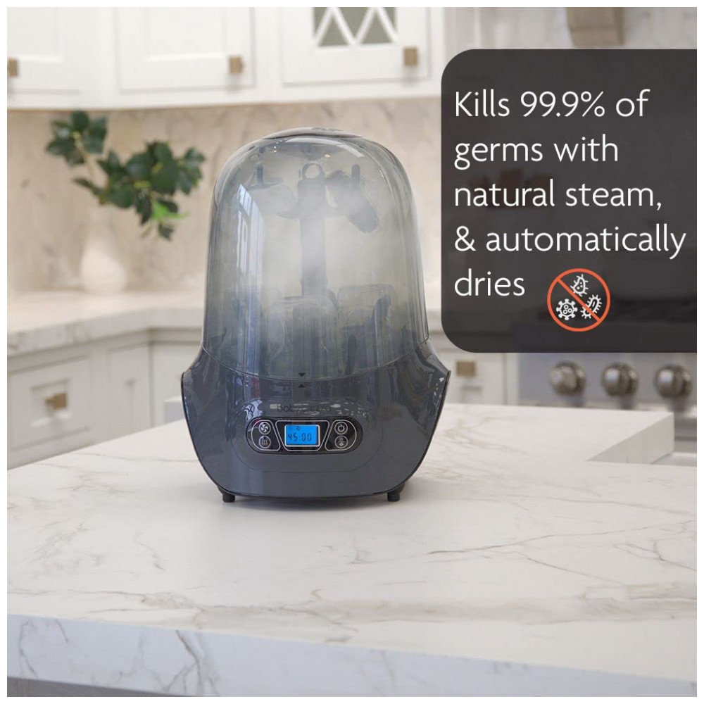Facilite a esterilização e secagem de mamadeiras, peças de bomba e acessórios com o secador esterilizador de uma etapa Baby Brezza. Em uma única etapa, você pode esterilizar e secar automaticamente até 6 mamadeiras, peças de bomba, chupetas e muito mais de qualquer marca. A máquina usa vapor natural para esterilizar com eficácia e depois seca com ar quente. Você pode usar o painel de controle LCD para selecionar entre quatro funções: Secador de Esterilizador, Somente Esterilizador, Somente Secador ou Rack de zenamento e três tempos de secagem: 30 min, 45 min, 60 min. Os produtos permanecem estéreis no interior por até 24 horas até que a tampa seja aberta. O Secador Esterilizador possui uma placa de aquecimento de aço inoxidável que protege contra ferrugem e acúmulo de água dura. Esteriliza automaticamente mamadeiras secas, peças de bomba tira leite, chupetas, mordedores, copinhos, brinquedos e outros acessórios em uma etapa fácil, economizando seu tempo. Agora disponível na cor carvão Usa vapor natural para esterilizar com eficácia e, em seguida, seca automaticamente com configurações de temporizador de 30, 45 ou 60 minutos à sua escolha Grande capacidade e universal comporta até 6 garrafas, peças de bomba e acessórios e funciona com todas as marcas de tamanhos 4 pol. 1 funcionalidade Use como esterilizador Secador, somente esterilizador, somente secador ou sistema de guardar