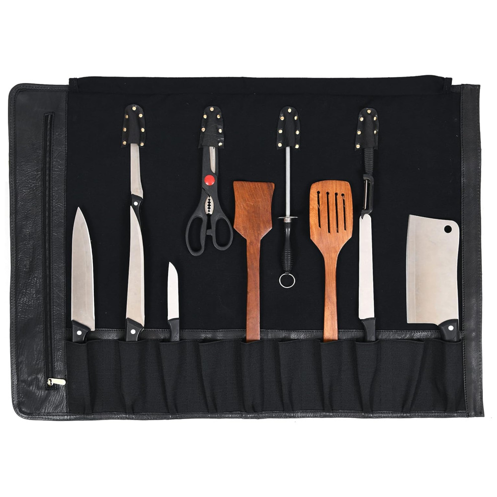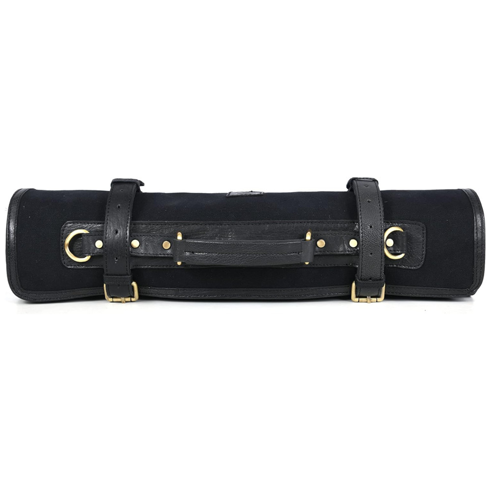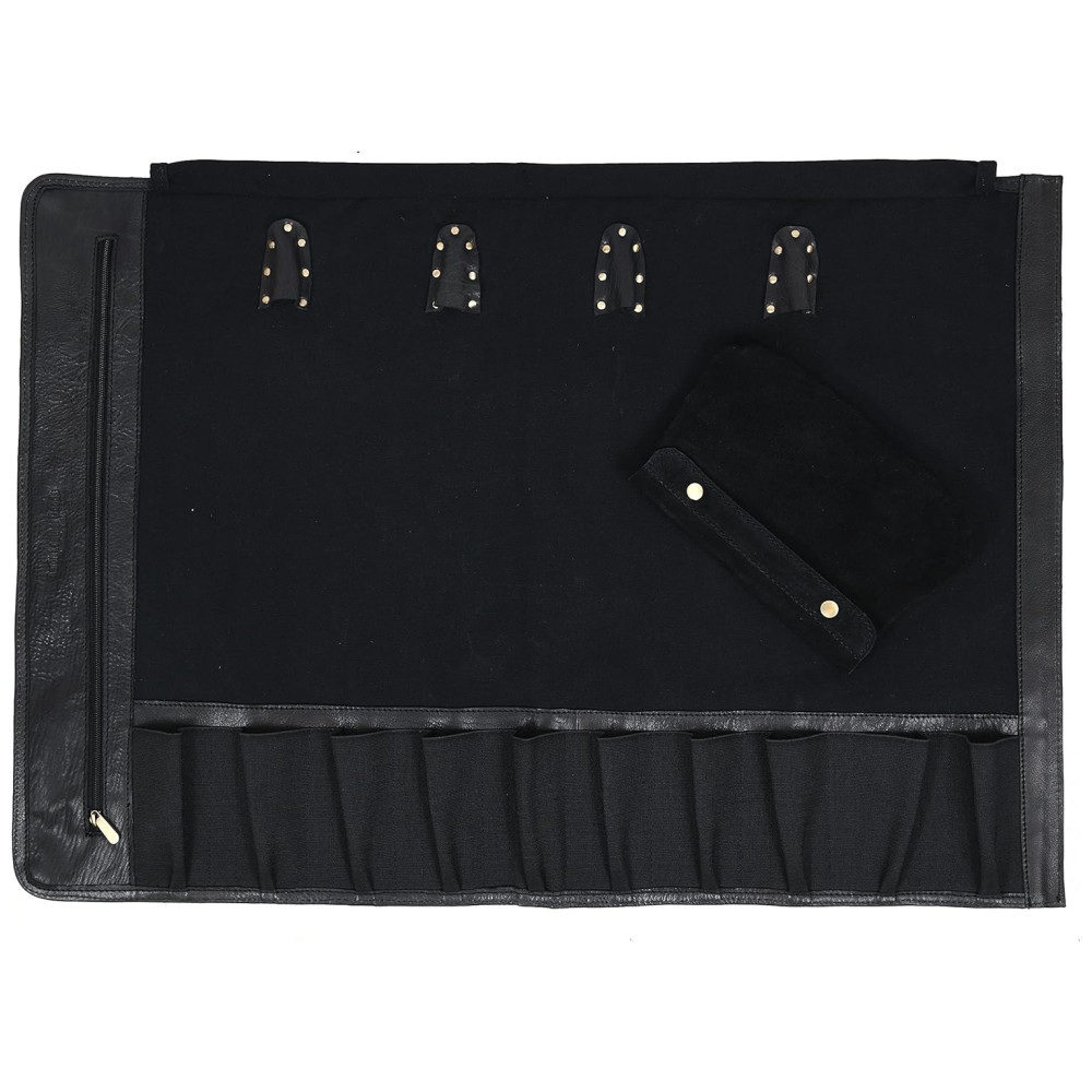 Existem 2 fivelas vintage elegantes que formam um rolo apertado, com bolsos elásticos para facas e 1 bolsa com zíper durável para manter as facas seguras enquanto você está em movimento.