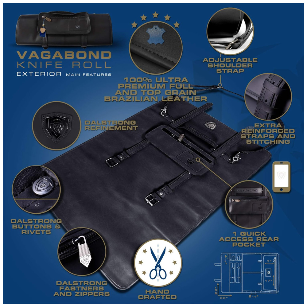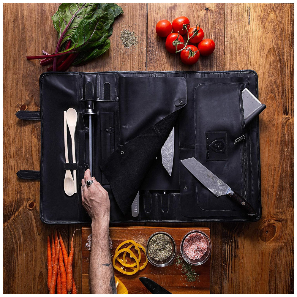 Feito à mão com couro brasileiro de poros finos ultra premium, 100 superior e de flor integral, que não é apenas durável, resistente a rasgos e perfurações, mas também extremamente macio e não abrasivo para você e seus investimentos culinários. Envolto com uma bela ligação de microfibra que envolve firmemente as bordas para preservar a forma e a estrutura perfeitas do rolo de faca. Equipado com fivelas de grau militar espessas e de força extra que mantêm com segurança seus investimentos de cozinha no lugar, extragrandes.