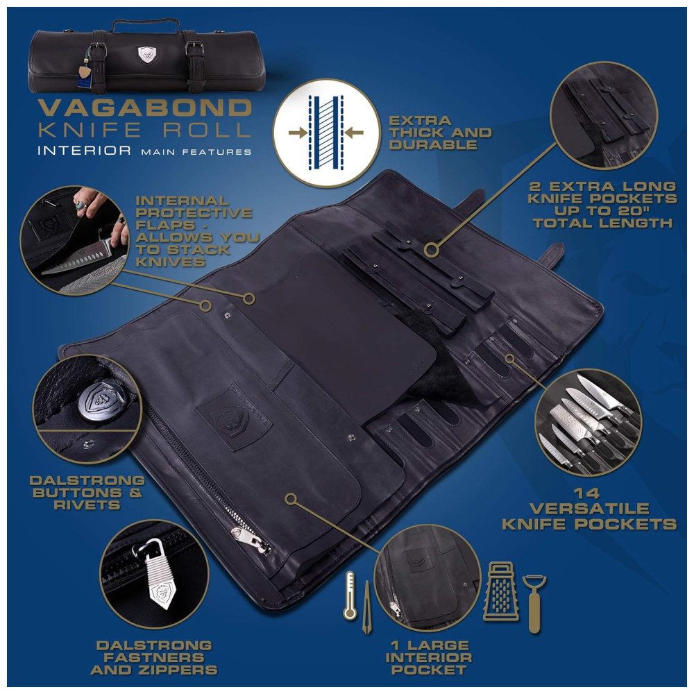 Apresentando 14 bolsos de faca com costura dupla, com um reforço elástico de ajuste profundo e perfeito que segura com segurança todas as suas facas Dalstrong premiadas, até 15 polegadas de comprimento, e dois bolsos de faca extralongos com prendedores de lâminas de vários tamanhos que acomodam suas facas mais longas até 20 centímetros de comprimento. Apresentando um bolso traseiro com fecho de zíper de acesso rápido exclusivo e elegante para blocos de notas, etiquetas, termômetros ou outras pequenas ferramentas de utilidade e pertences pessoais.