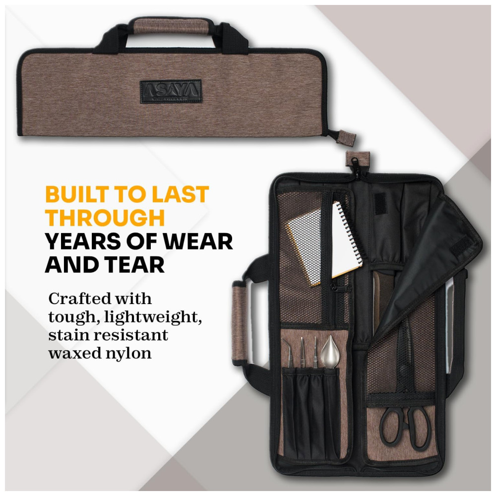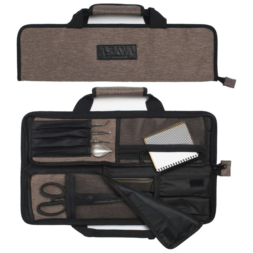 ARTESANATO ESPECIALIZADO Os rolos de facas Asaya são meticulosamente projetados para criar os estojos de viagem perfeitos para suas facas e equipamentos de chef. Feitos à mão com nylon resistente, leve e resistente a manchas, eles são construídos para durar muitos anos de uso e desgaste da cozinha. Queremos que nossos Chefs sejam configurados com o melhor equipamento possível que os dure por toda a vida.
