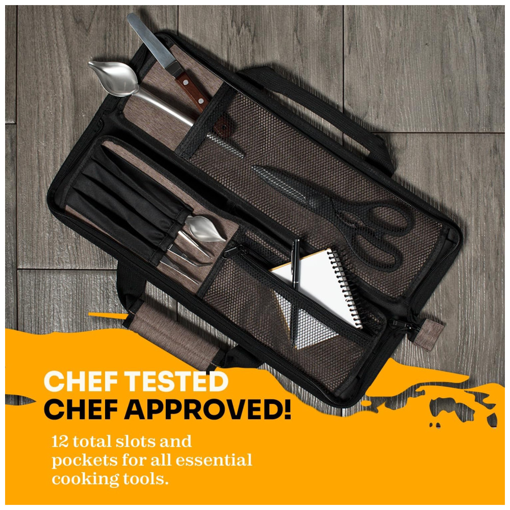 ESPAÇOSO E ESPAÇOSO Com 12 slots de faca no total e bolsos com zíper, este estojo de faca profissional pode transportar facilmente um conjunto completo de facas de chef e utensílios de cozinha