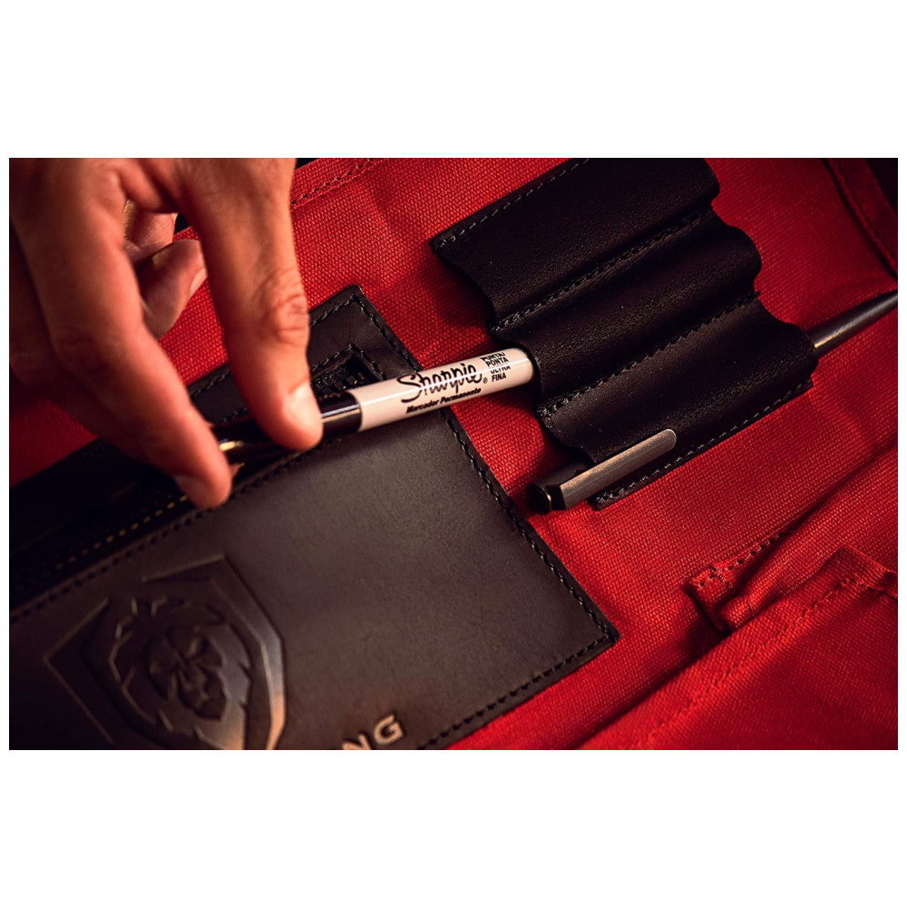 Experimente um verdadeiro rolo de faca espaçoso. Apresentando 10 bolsos de faca que seguram com segurança todas as suas facas Dalstrong premiadas de até de comprimento. Um bolso traseiro com zíper de acesso rápido para blocos de notas, etiquetas, termômetros ou outras pequenas ferramentas e pertences pessoais, um bolso para cartão de visita, um bolso interno com zíper perfeito para receitas, chaves e outros pertences pequenos e 3 bolsos utilitários internos para canetinhas e canetas