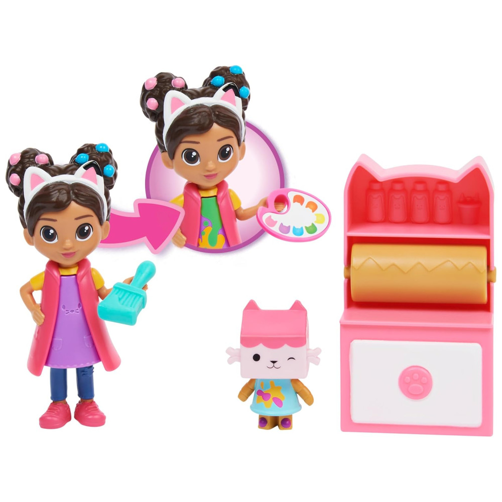 BONECA COM RECURSO DE AÇÃO Pressione as orelhas de gato da figura colecionável da Gabby Girl para fazer o avental de artista de Gabby se transformar de limpo em respingado de tinta Pressione para baixo novamente para torná lo limpo