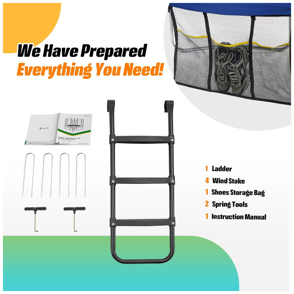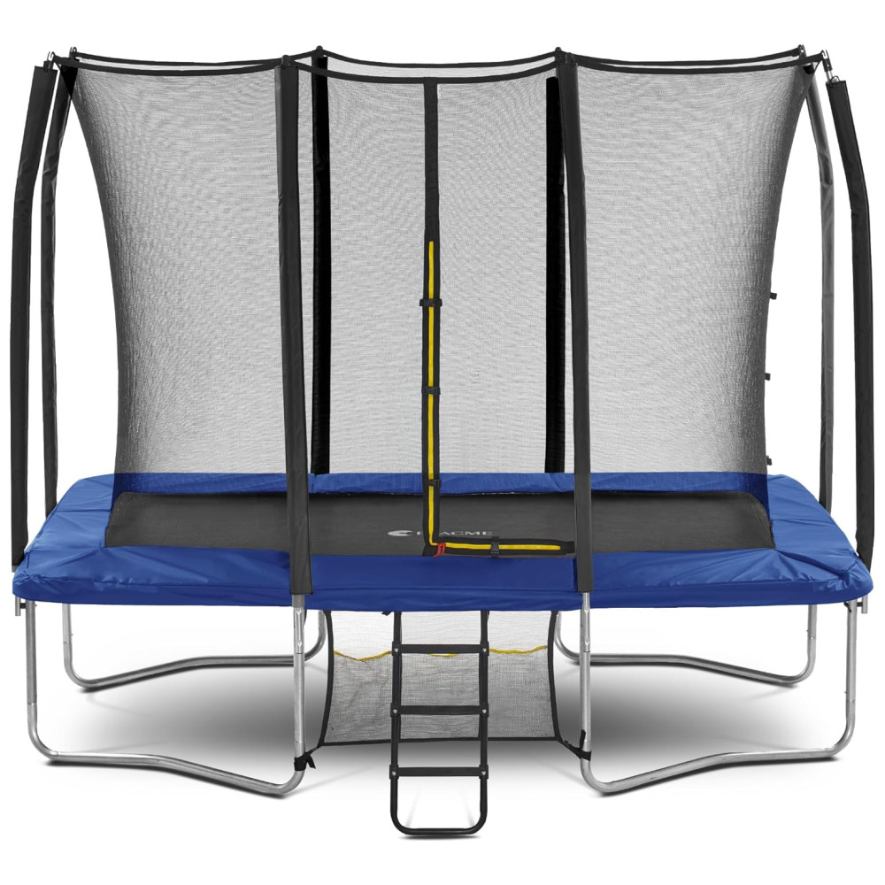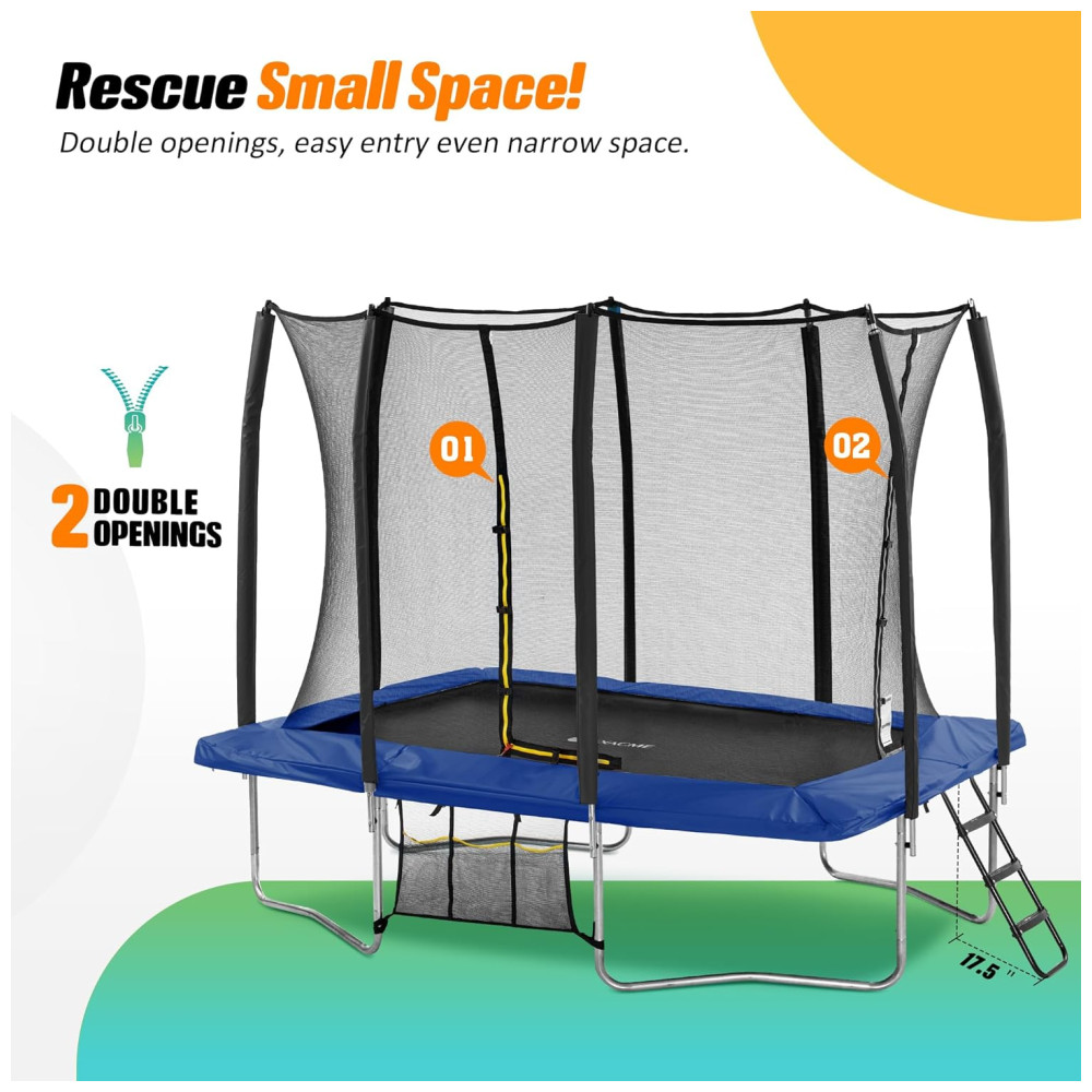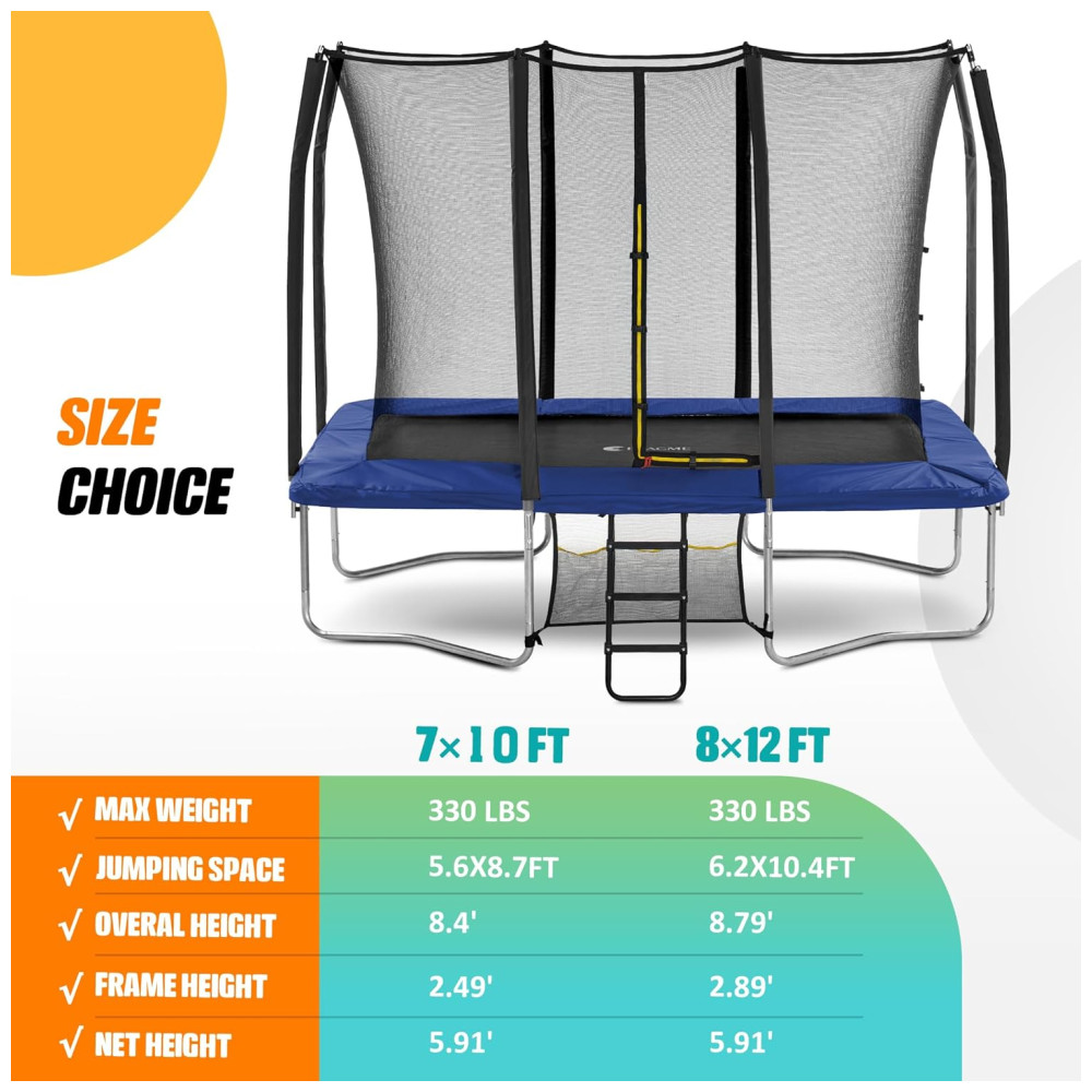 Exacme 7X10 8X12 pés com aberturas duplas de gabinete trampolim retangular para crianças pequeno trampolim retangular externo com rede de gabinete escada larga 4 estacas de vento bolsa de zenamento de sapatos capacidade de 330LB azul 7 × 10 pés