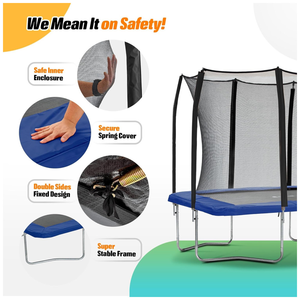Steady Frame Multi Safety Measures O trampolim retangular ExacMe atende ou excede todos os padrões da Sociedade Americana de Materiais de Teste ASTMF381 16 ASTMF225 15 . A estrutura é feita de aço galvanizado resistente, proporcionando grande confiança ao pular. O design do invólucro interno deixa espaço suficiente da rede aos postes para evitar colisão quando as crianças caem e também evita que os pés das crianças pisem nas molas. Material durável Resistência às intempéries Queremos fazer companhia aos seus filhos para crescerem. A estrutura galvanizada resistente com molas galvanizadas por imersão a quente é difícil de enferrujar e deformar, proporcionando uma experiência suave e duradoura de salto. Quando você usa o trampolim recreativo, nunca permitimos que seu trampolim fique feio. Manterá a cor brilhante devido ao teste de 500 horas de proteção solar. As mangas para bastões também evitarão a degeneração da espuma para suportar melhor o seu trampolim. Limitação de espaço de quebra de aberturas duplas Diferente dos outros trampolins retangulares, adicionamos aberturas tanto no lado longo quanto no lado curto para o trampolim externo, o que pode ajudá lo a entrar nele facilmente de diferentes direções. Graças a isso, você não precisa escolher uma cama elástica redonda menor devido ao espaço de comprimento desigual. Essa é a nossa busca para dar ao seu filho o máximo de espaço possível para aproveitar a infância Mais molas Maior Espaço de salto válido As molas funcionam de forma independente no trampolim retangular, o que significa que você pode obter o melhor salto em todos os pontos, sem pontos mortos, em vez de apenas obter o melhor saltar no ponto central de um trampolim redondo. Portanto, você pode obter facilmente um espaço de salto maior sem aumentar o tamanho do trampolim. Além disso, este trampolim retangular tem mais molas que proporcionarão maior salto em comparação com a execução de habilidades difíceis com outros trampolins Acessórios completos Monte e aproveite O trampolim vem com 3 caixas, aguarde pacientemente o recebimento de todas as caixas, pois elas podem não ser entregues em o mesmo tempo. Está equipado com todas as ferramentas e acessórios necessários. Você não quer que suas mãos machuquem ou que seu trampolim visite seus vizinhos, certo Portanto, 2 ferramentas de mola e 4 estacas de vento estão preparadas para eliminar suas preocupações. A escada larga e antiderrapante protegerá seus filhos de ferimentos nos pés. Você não precisa suportar sapatos jogados. Multi escolha Atenda às suas necessidades Este trampolim vem em laranja quente, azul frio e cinza suave. Quer esteja à procura de frescura num dia quente de verão, ou da sensação de calor ao pôr do sol, mesmo que pretenda treinar a calma do seu filho, podemos sempre satisfazê lo. Além disso, oferecemos dois tamanhos de 7×10 pés e 8×12 pés para você. Vai se tornar um canto natural do seu quintal
