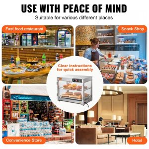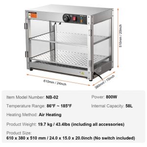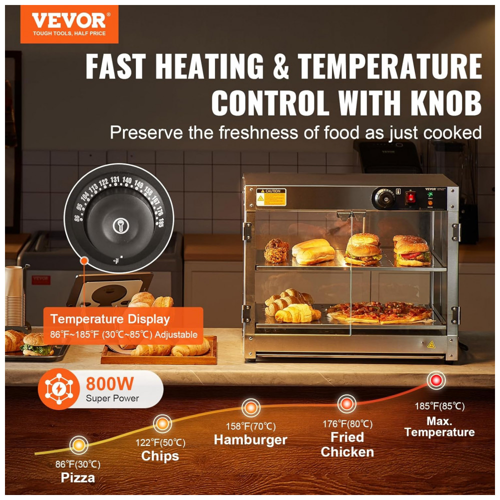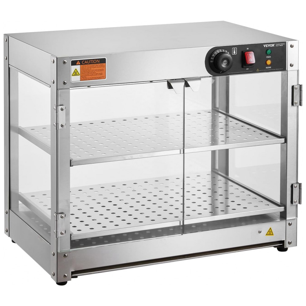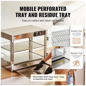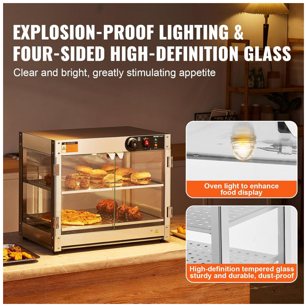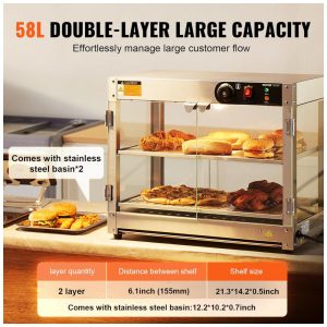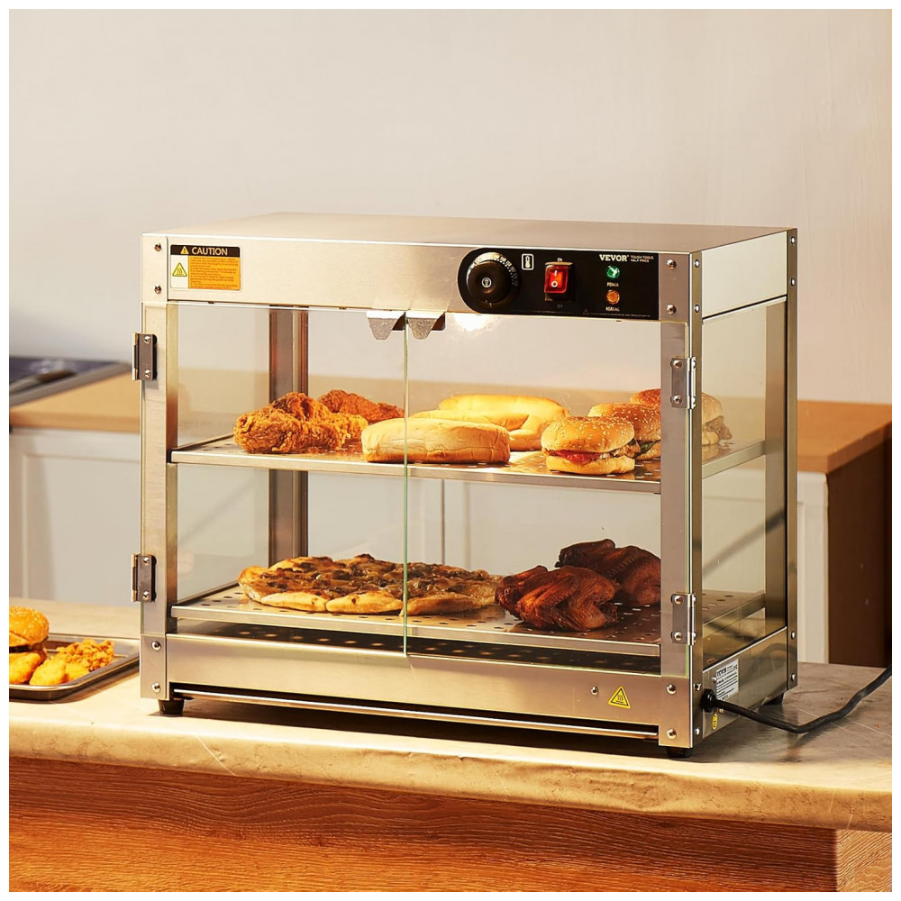 O Expositor Aquecedor de Alimentos VEVOR 2 Níveis é um equipamento de bancada em aço inoxidável resistente à corrosão, projetado para exposição térmica de hambúrgueres, pizzas, pães e frango frito em quiosques, cinemas, lojas de conveniência, cafeterias e snack bars comerciais. Equipado com base de aquecimento de 300 W e lâmpada de aquecimento de 60 W, inclui painel de controle intuitivo com defletor superior para carregamento sem danos e pá em aço inoxidável para porcionamento eficiente. A base possui furos de drenagem conectados a bandeja coletora removível para escoamento de óleo e resíduos.