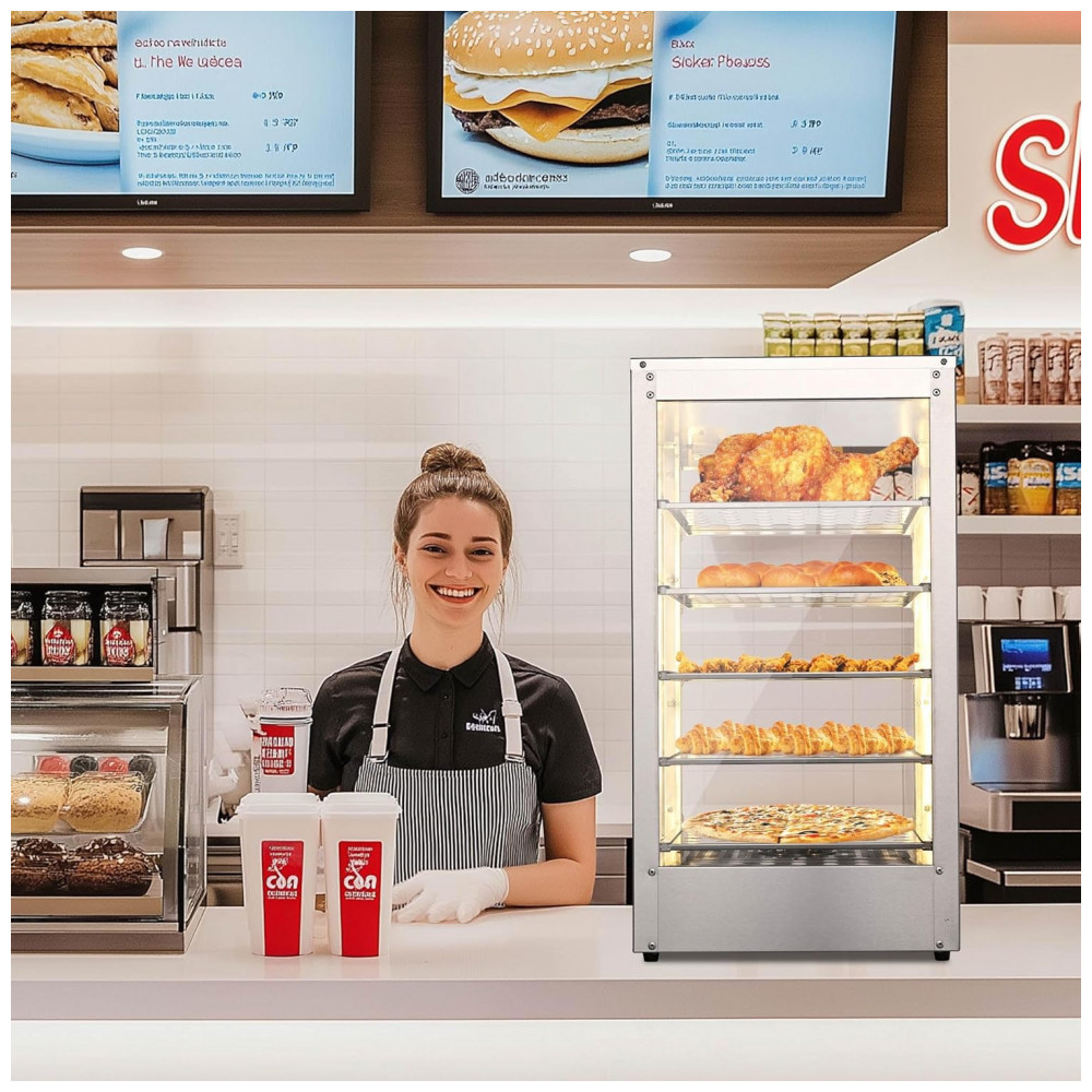 O Expositor Aquecedor de Alimentos Comercial WeChef 5 Andares de 600W oferece 5 prateleiras para armazenamento otimizado, compatível com pizzas de até 28 cm por nível, economizando espaço no balcão em cafés, conveniências e estabelecimentos comerciais. Controle de temperatura termostático com knob rotativo ajusta de 14°C a 85°C, mantendo calor constante e protegendo contra superaquecimento para operação precisa em ambientes de alto volume.