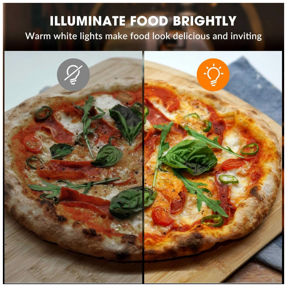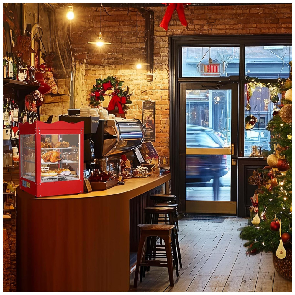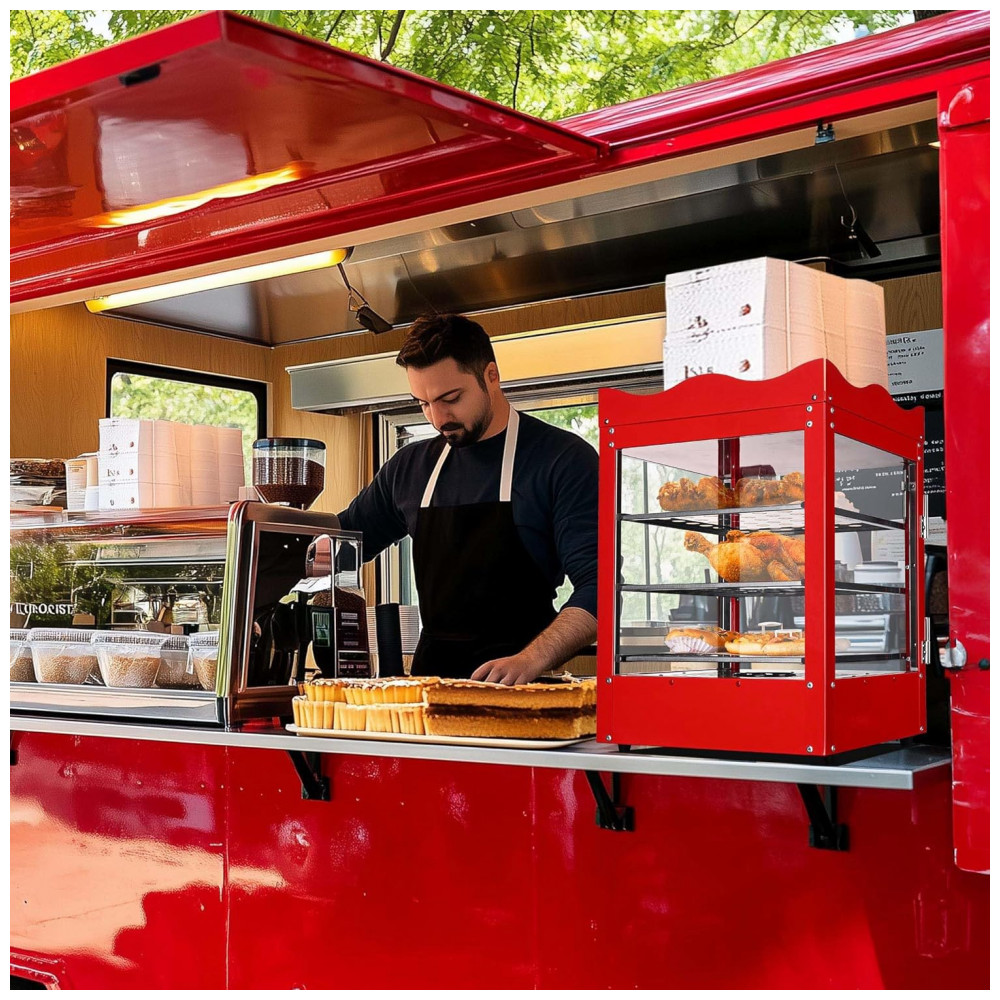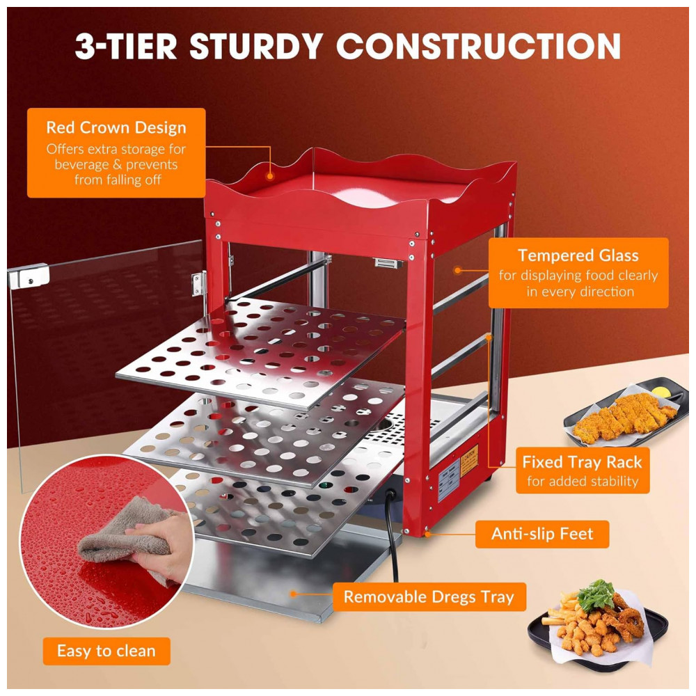O Expositor Aquecedor de Alimentos Comercial WeChef 3 Andares de 600W apresenta estrutura em aço inoxidável 430 com moldura vermelha e design de coroa superior para exibição atrativa de pizzas, pretzels, tacos, totopos, hambúrgueres e tortas de ovo. Equipado com tiras de LED warm white 3000K em ambos os lados, ilumina os alimentos de forma uniforme, destacando sua aparência fresca e lustrosa através de vidro temperado de alta definição em todas as direções, otimizado para visibilidade em restaurantes, padarias, cafés e food trucks.