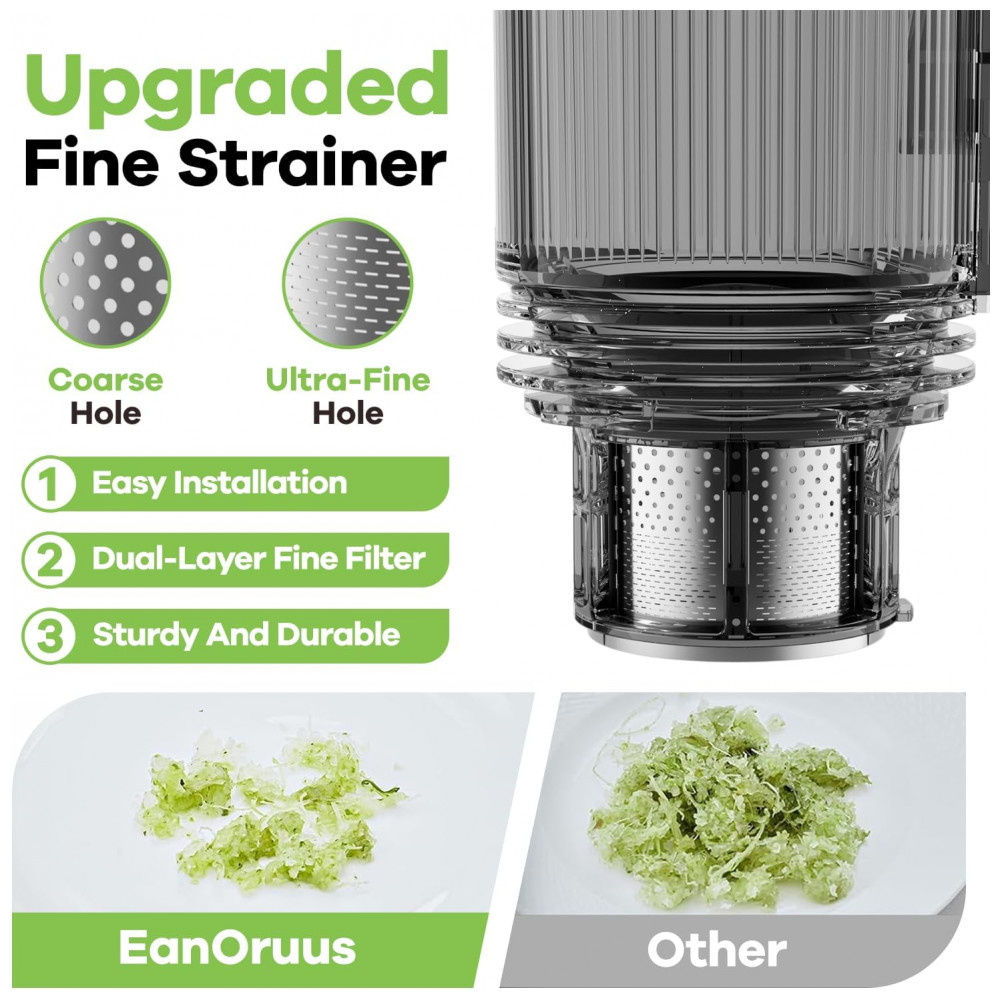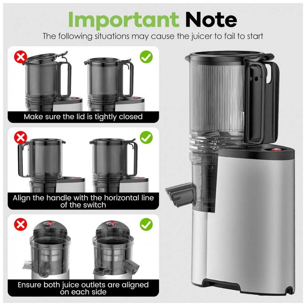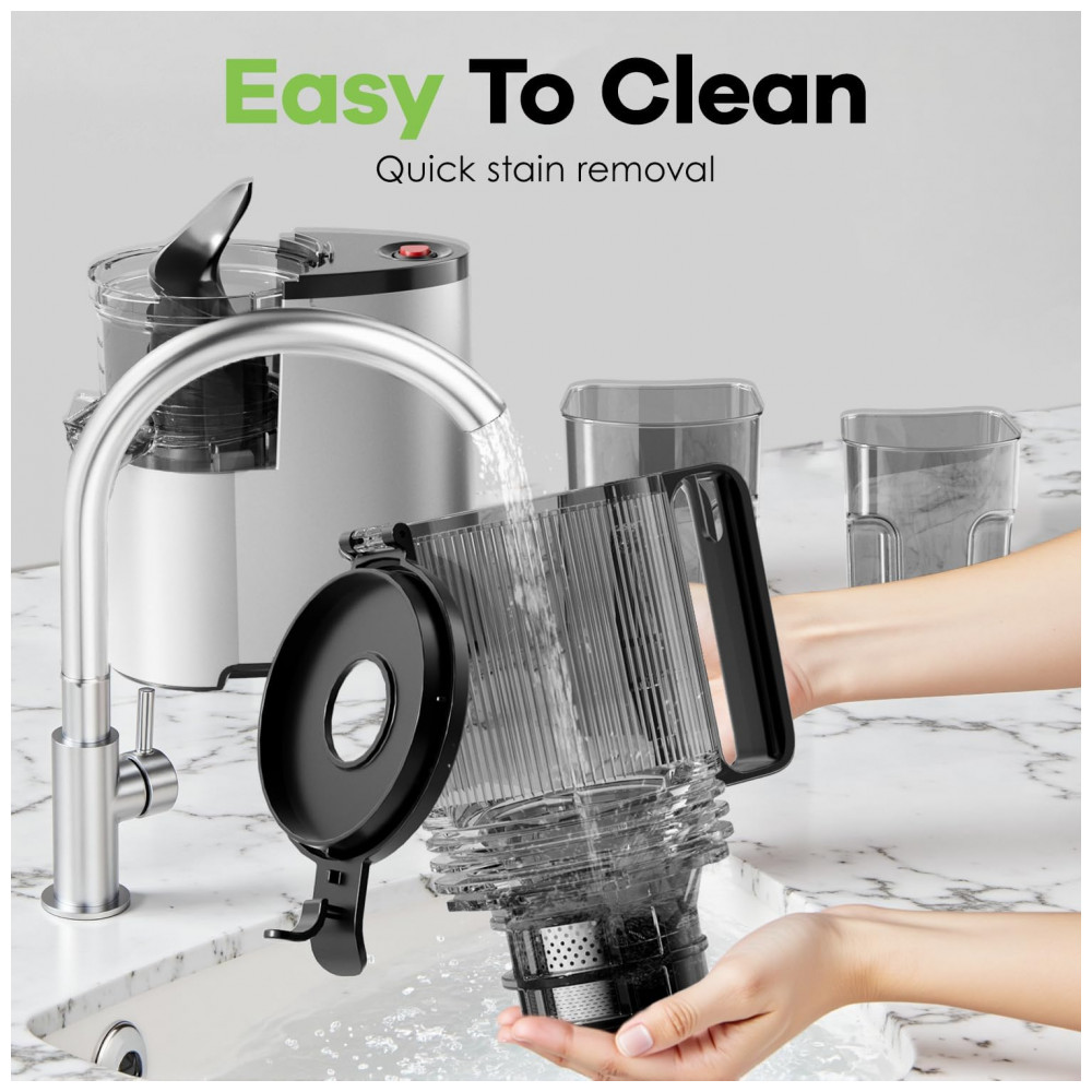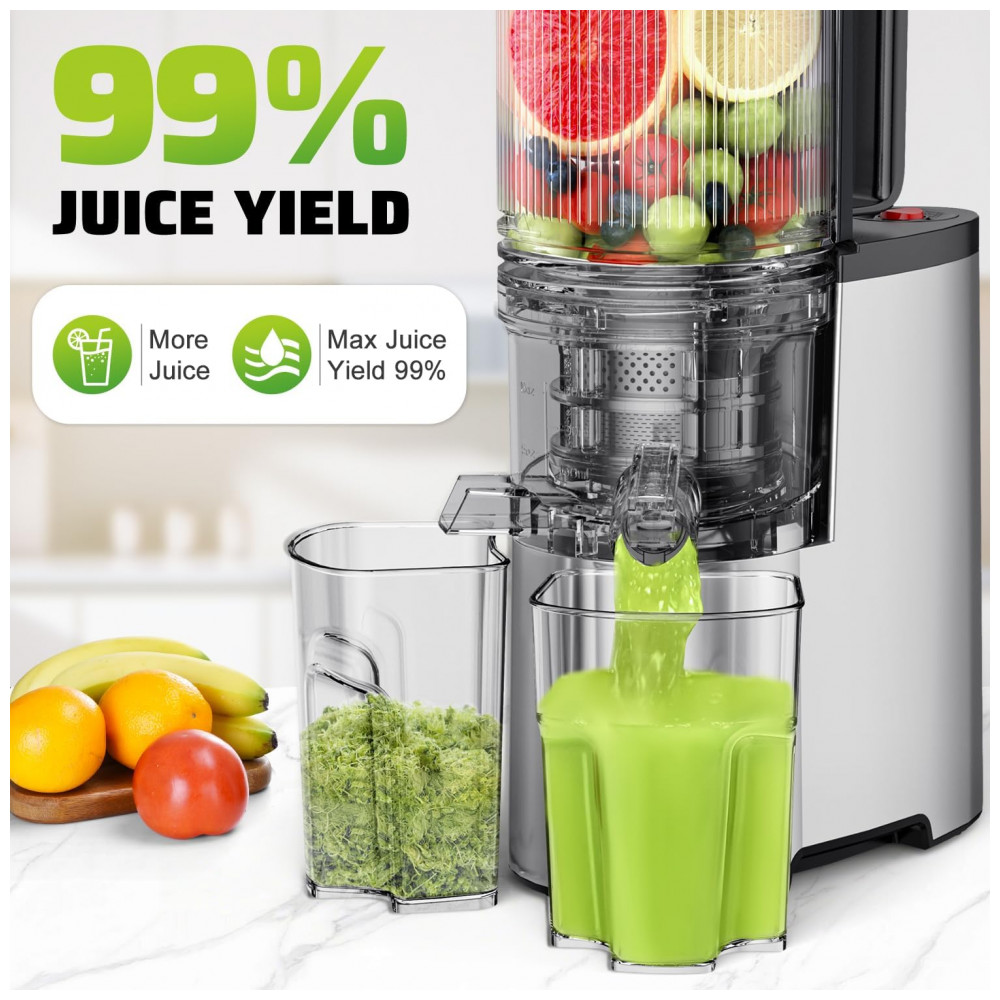 O Extrator de Suco com Bocal de 14,7cm permite extrair suco de frutas e vegetais inteiros sem a necessidade de cortá-los, tornando o processo mais conveniente e seguro, inclusive para crianças. Com motor de 400W, esse extrator utiliza tecnologia de extração lenta para obter até 99% a mais de suco, separando eficazmente o bagaço e preservando mais nutrientes. Graças à tecnologia de mastigação poderosa, que evita a geração de calor e oxidação, este aparelho extrai 30% mais suco delicioso. Além disso, conta com filtros duplos para uma separação profunda do resíduo do suco, resultando em um suco mais saboroso e sem resíduos. A extração lenta e a tecnologia Cold Press preservam a estrutura celular das frutas, produzindo sucos mais frescos e nutritivos, com menos oxidação e espuma. Inclui um guia de solução de problemas para garantir o correto funcionamento do extrator.