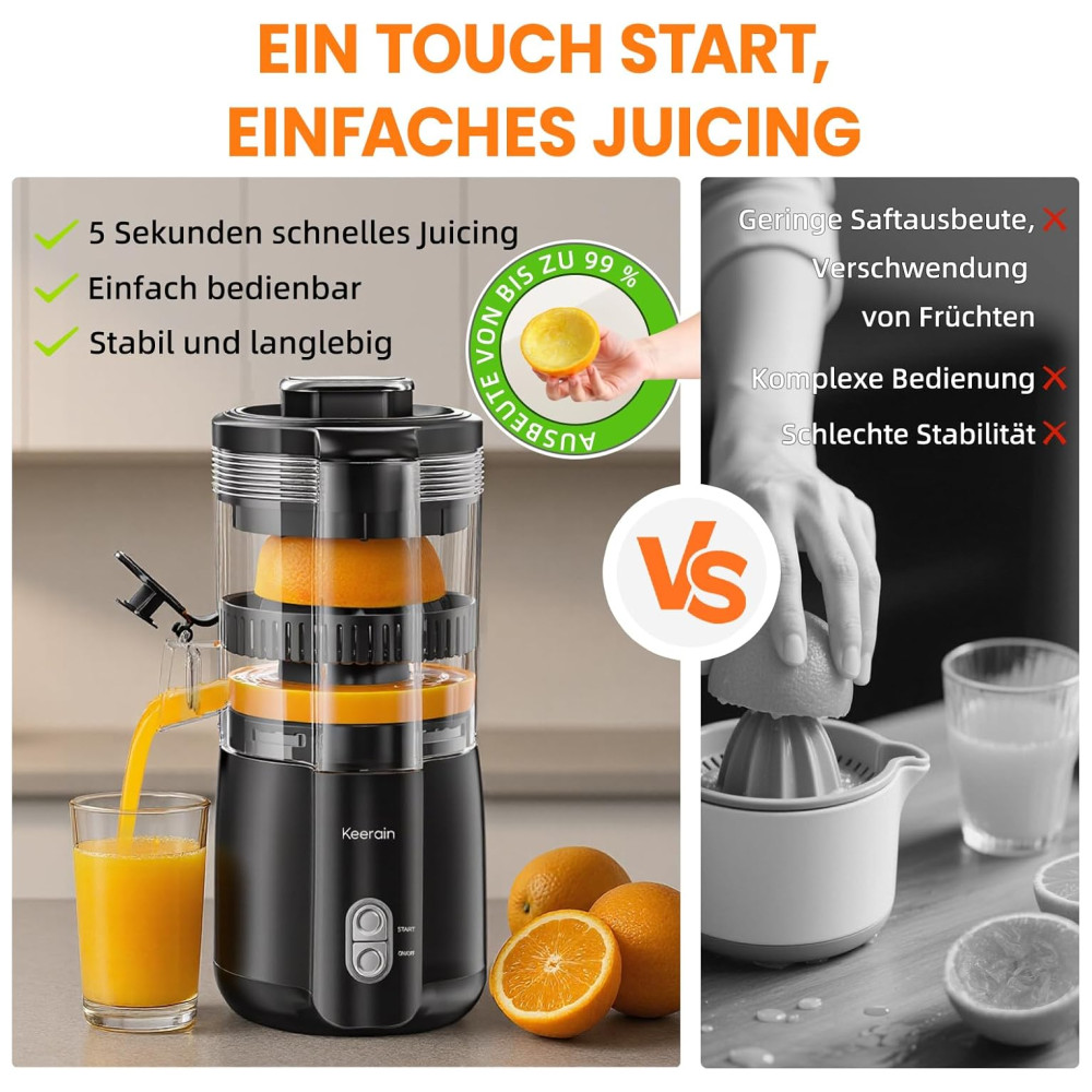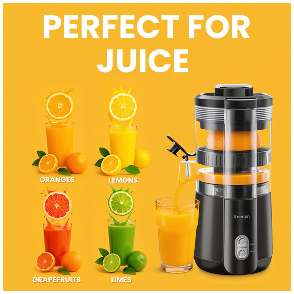 O Extrator de Suco Elétrico Keerain é a escolha perfeita para os amantes de frutas cítricas! Com operação com um toque, você terá seu suco em apenas 5 segundos. Até as crianças podem facilmente preparar seu próprio suco, sem complicações. Este extrator eficientemente extrai cada gota das suas laranjas, com desperdício mínimo, economizando dinheiro. Fácil de limpar, com copo e cones removíveis. Armazenamento conveniente devido ao design compacto. Versátil para diferentes frutas, funciona bem com frutas cítricas e mais duras como maçãs.