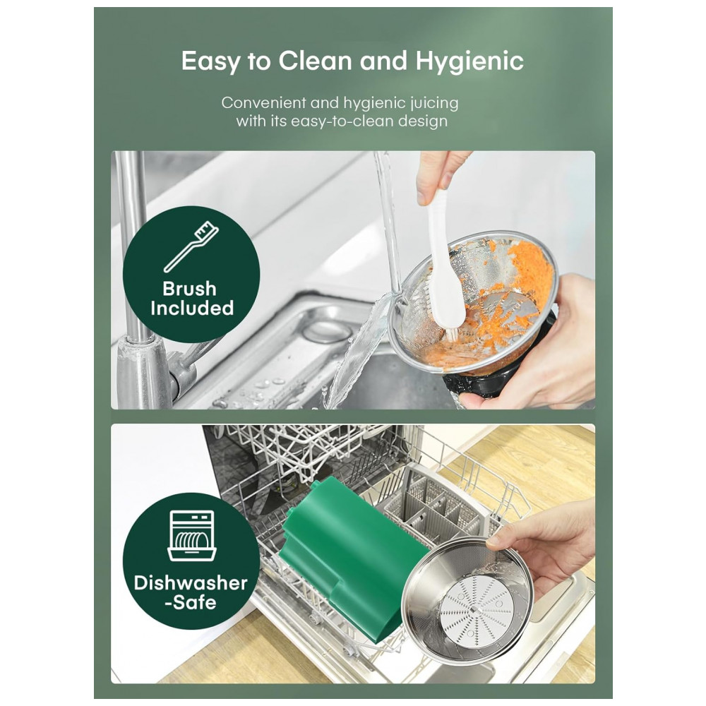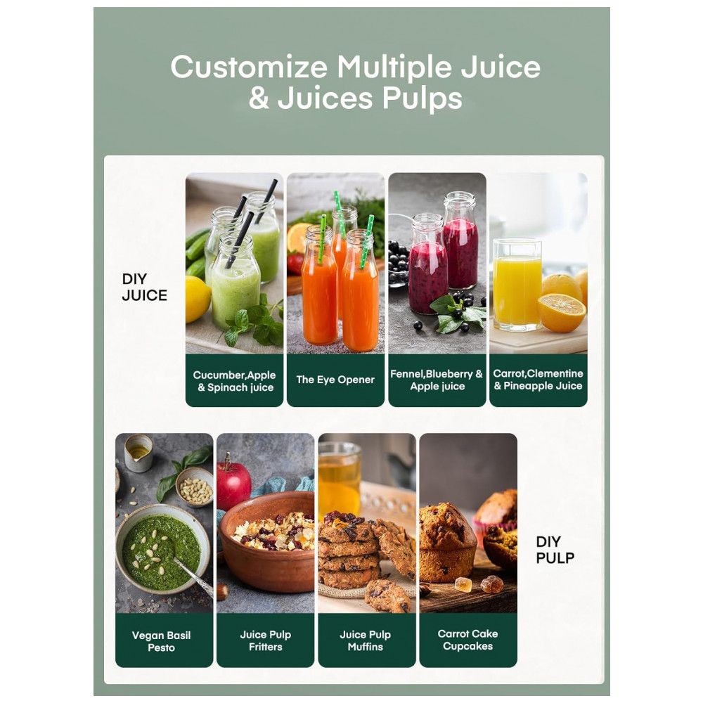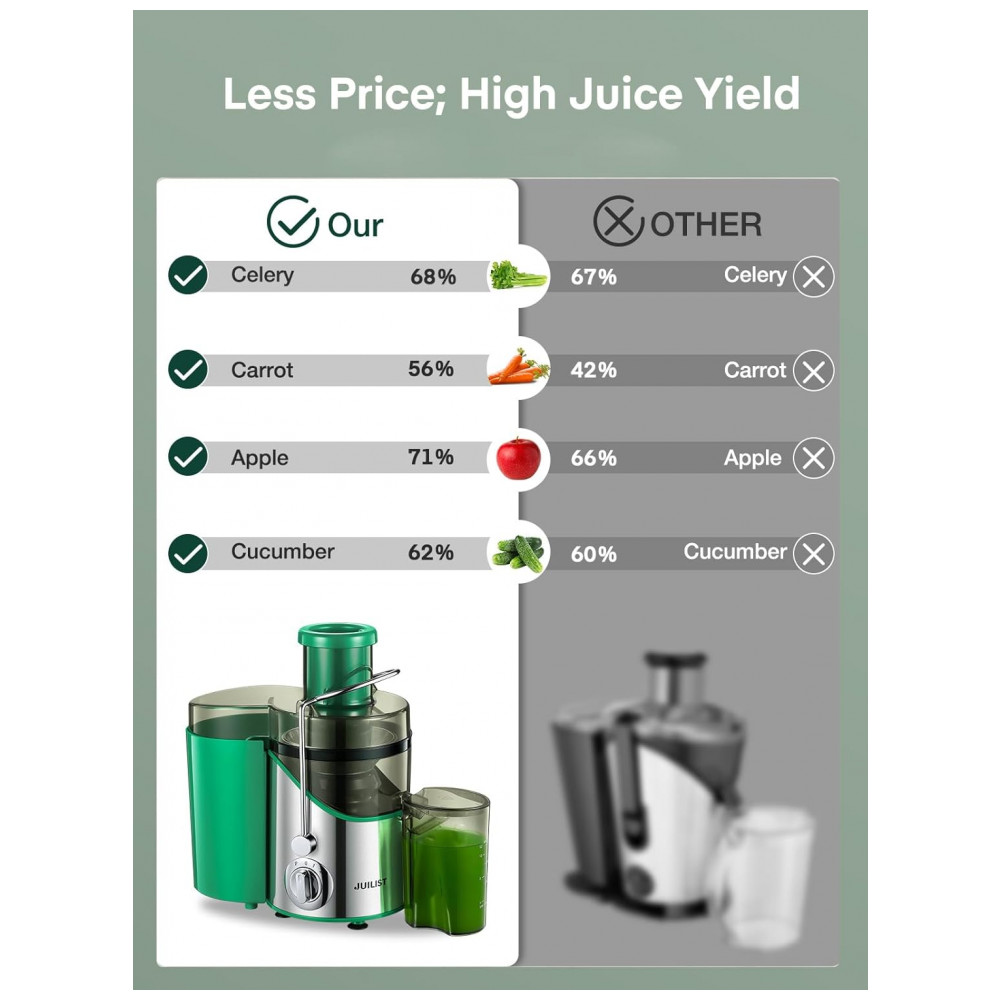 Cansado de passar muito tempo fazendo suco? O extrator de suco Juilist possui alta potência com motor de 800W que extrai sucos de frutas e vegetais em apenas 8 segundos, com resultados mais saborosos do que os métodos tradicionais. Com bocal de alimentação largo de 7,62 cm para diferentes tipos de frutas e vegetais, economizando tempo de preparo. Seu design compacto ocupa pouco espaço na bancada, mas oferece um rendimento 26% maior do que outros extratores de 800W. Fácil de usar, com controle de uma tecla, montagem simples e limpeza descomplicada. Com 3 velocidades para diversos alimentos, permitindo a personalização de sucos. Ideal para trazer mais cor e nutrientes para sua rotina!