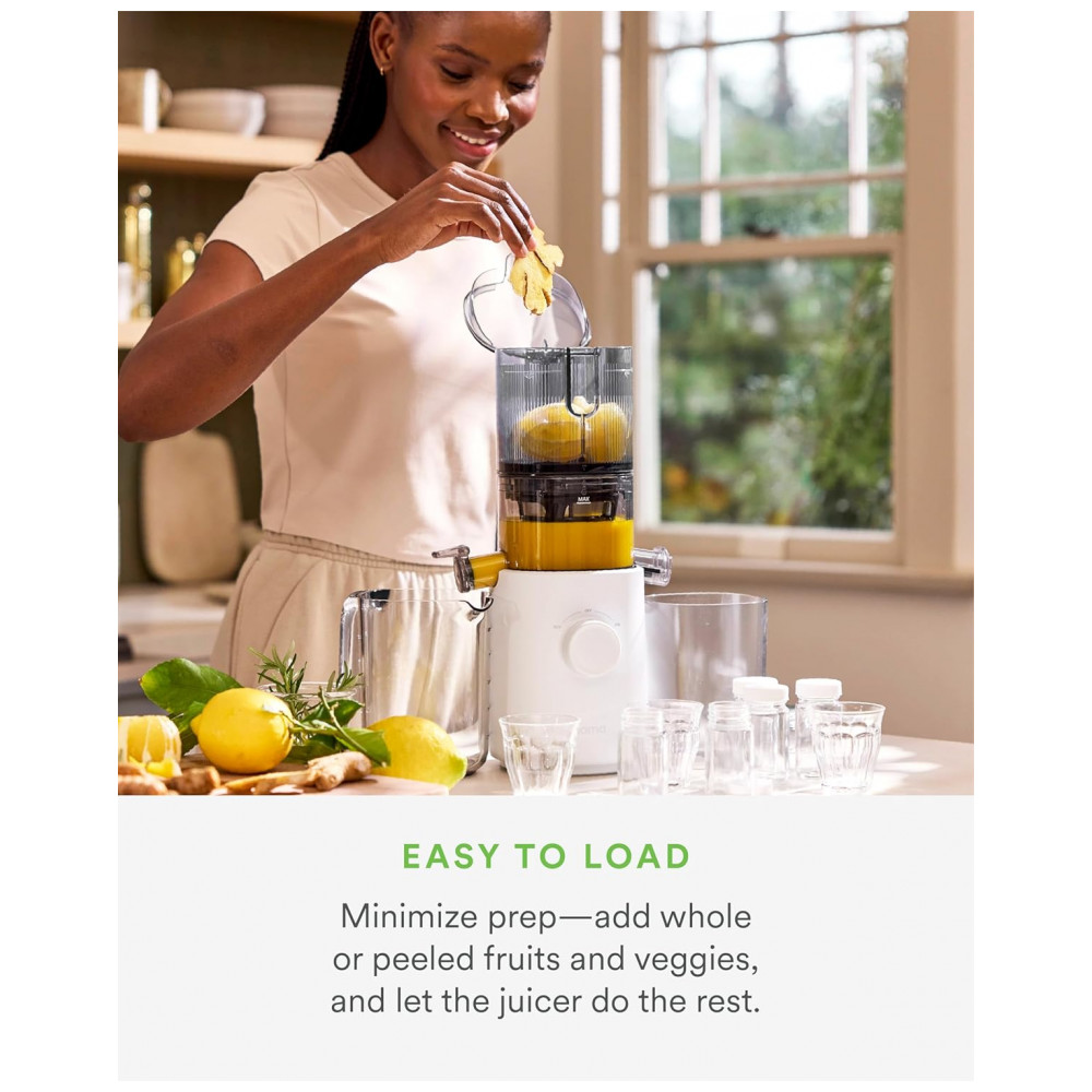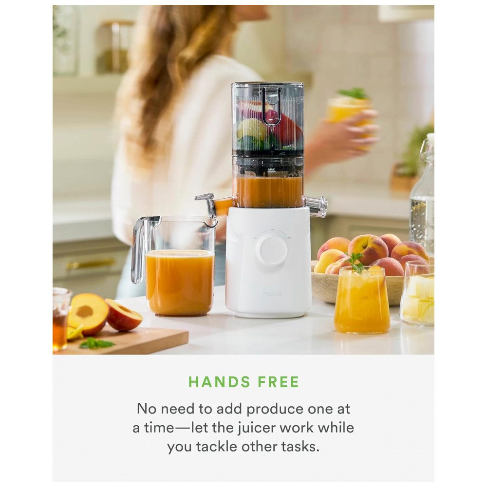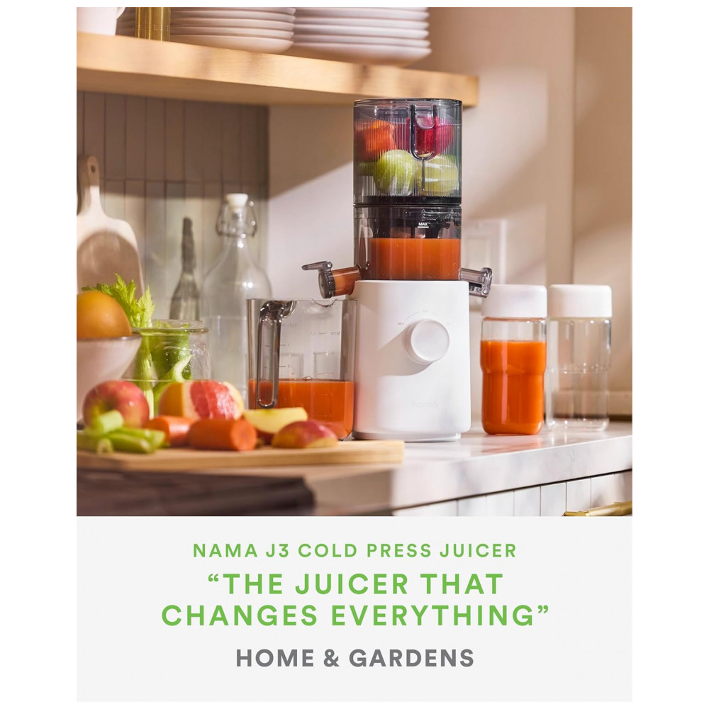 O Nama J3 é uma máquina de suco compacta perfeita para frutas e vegetais. Portátil e otimamente projetado para cozinhas pequenas, mantenha sua rotina saudável de sucos onde quer que vá. Diga adeus ao tempo desperdiçado adicionando seus ingredientes um por um. O alimentador automático permite que você carregue toda a sua receita de uma vez, libertando-o para realizar várias tarefas na cozinha. Com velocidade de prensagem lenta, o suco de frutas e vegetais mantém os nutrientes intactos, preservando sabor e valor nutricional. Com motor de 130W, funciona silenciosamente a 50 RPM para um desempenho duradouro. Inclui recipiente de suco, recipiente de polpa, peneiras, escova de limpeza e livro de receitas. Limpeza e montagem fáceis com peças de liberação rápida. Aproveite uma experiência sem complicações do início ao fim.