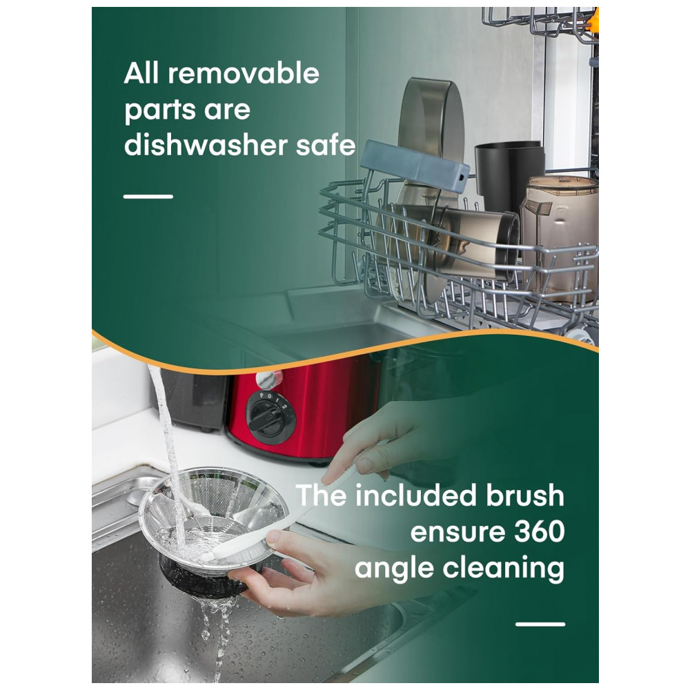 Seu design inclui função antirrespingos para manter o ambiente limpo, e todas as partes desmontáveis são próprias para limpeza em lava-louças. Acompanha escova para facilitar a higienização após o uso. Com coletor de polpa de 2 litros, minimiza a necessidade de descarte frequente.