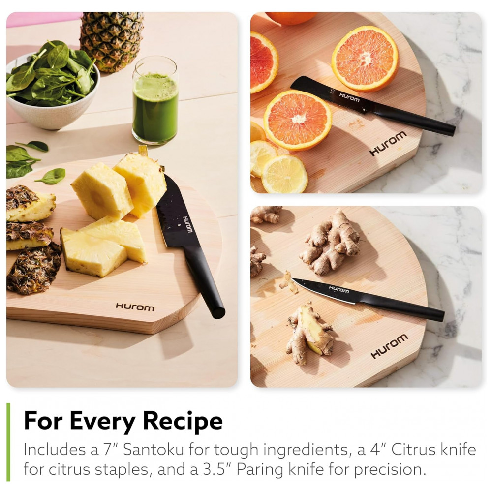 O Extrator de Sucos Hurom H320 e o Conjunto de Facas de Frutas e Vegetais tornam um estilo de vida mais saudável impulsionado pela nutrição mais fácil. A inovadora tremonha autocomedora do H320 permite adicionar frutas inteiras, reduzindo a necessidade de picar, enquanto a prensa a frio do extrator é complementada por uma abertura maior e uma entrada ampliada para adicionar mais ingredientes enquanto o extrator está em funcionamento. A máquina de suco de prensa a frio é projetada com nossa tecnologia patenteada de Espremer Lento, que minimiza a oxidação para um suco mais fresco e rico em nutrientes. A máquina de suco de frutas também apresenta um exclusivo sem-fim de baixa velocidade que extrai até a última gota de suco possível de frutas e vegetais, garantindo um sabor mais fresco que dura até 72 horas. O conjunto de facas irá ajudá-lo a fatiar e picar em todas as receitas. O conjunto inclui uma faca Santoku para cortar ingredientes duros, como beterrabas e aipo, uma faca Cítrica ideal para cortar qualquer fruta cítrica e uma faca de Desbaste para maior precisão. Com um acabamento moderno e elegante em preto fosco, as facas são feitas de aço alemão premium com revestimento protetor antiaderente e resistente à corrosão. EXTRATOR PARA FAMÍLIA O Extrator de Sucos H320 foi projetado com uma tremonha de alto volume autocomedora e uma abertura maior para adicionar mais ingredientes mesmo enquanto o extrator está em funcionamento. É a escolha perfeita para famílias e entusiastas de sucos comprometidos. FACAS PARA CADA RECEITA O conjunto de facas inclui uma faca Santoku,faca Cítrica, e faca de Desbaste. Modernas e elegantes com acabamento preto fosco, as duráveis facas de aço alemão são de longa duração, com revestimento antiaderente e resistente à corrosão. CADA GOTA CONTA Nossa tecnologia patenteada de Espremer Lento minimiza a oxidação para um suco mais fresco e rico em nutrientes. O extrator de suco por mastigação extrai até a última gota de suco possível de frutas e vegetais, garantindo um rendimento maior e um sabor mais fresco que dura até 72 horas. MOTOR SILENCIOSO O motor quase silencioso é realmente discreto e não acordará a casa antes do café da manhã – perfeito para as primeiras horas da manhã e noites tranquilas. Sua montagem fácil também torna o extrator de suco ideal para iniciantes e veteranos no hábito de fazer sucos. INOVADOR A Hurom tem mais de 40 anos de experiência em orientar as pessoas para um estilo de vida mais saudável impulsionado por uma ótima nutrição. Desde frutas coloridas até folhas verdes e vegetais, tudo o que normalmente mastigamos com os dentes, nossos sucos extraem e as facas cortam facilmente.