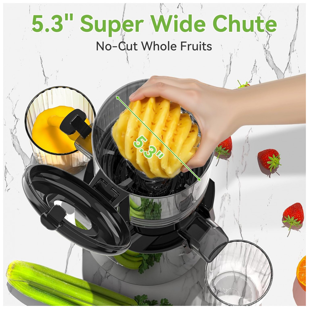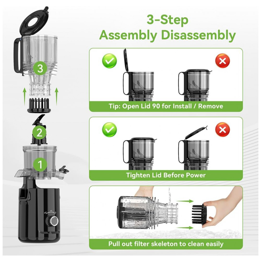 Extrator de Sucos Prensa Fria Hzon e 300W Boca Larga 135 cm Extração Lenta 50 rpm Silencioso Livre de BPA Limpeza Fácil Preto