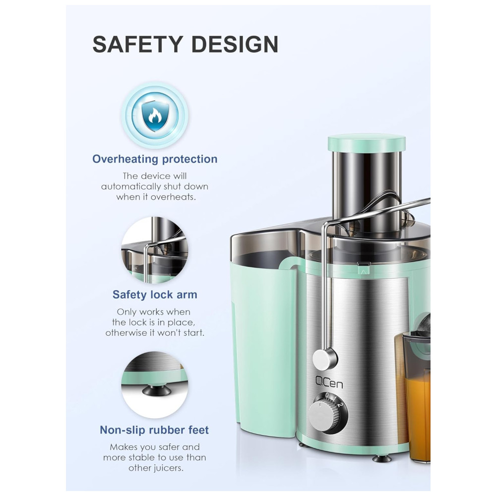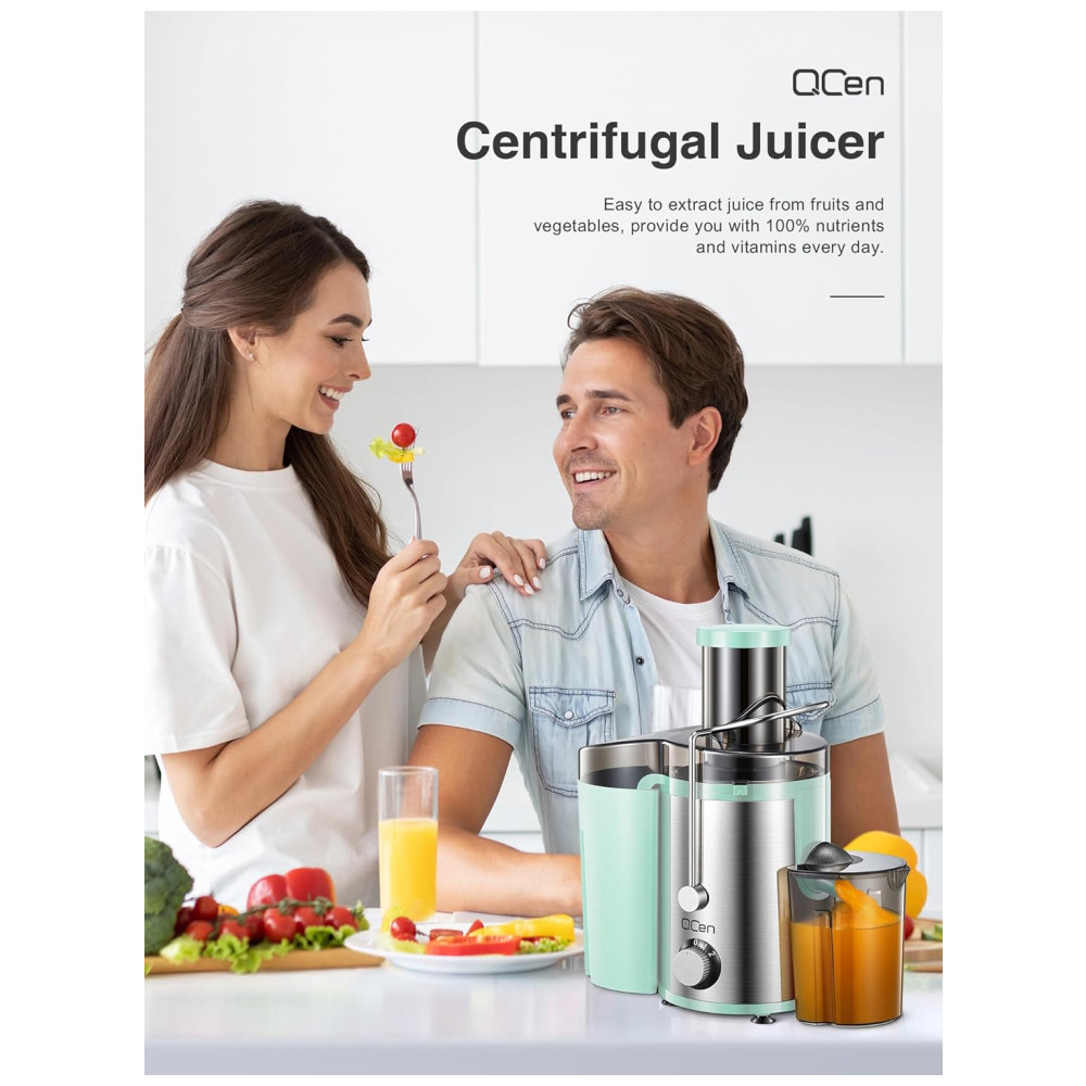 O Extrator de Sucos QCen conta com um motor centrífugo de 800W, mais eficiente e poderoso do que os extratores de suco prensados a frio, oferecendo maior durabilidade. Sua boca larga de 3 alimentações economiza tempo, evitando a necessidade de cortar tudo em pedaços pequenos. Com 2 velocidades, é ideal para frutas e vegetais macios e duros. Além disso, possui design de segurança, sistema de proteção contra sobreaquecimento e peças removíveis que facilitam a limpeza. Aproveite a praticidade e eficiência deste produto!