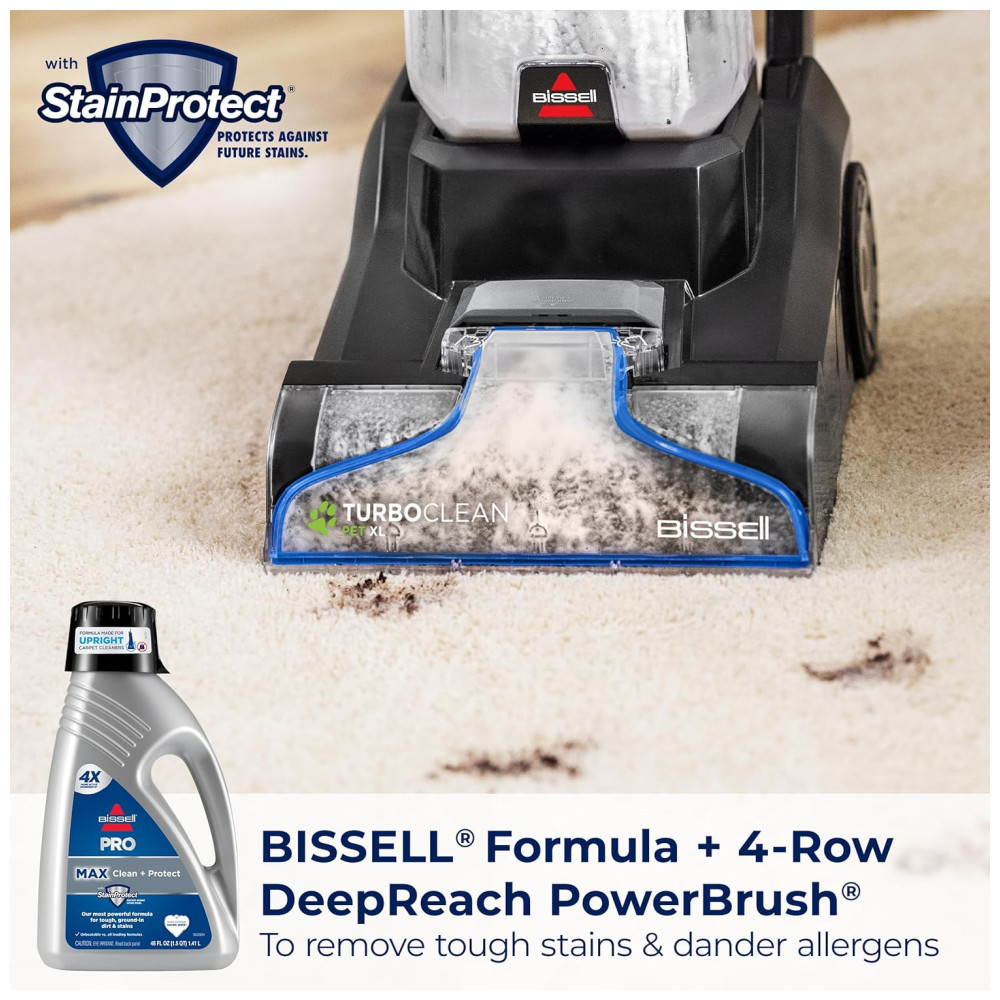 A fórmula BISSELL PRO MAX Clean Protect com tecnologia StainProtect combinada com a escova Powerbrush 4Row DeepReach remove facilmente manchas difíceis de animais de estimação, sujeira incrustada e alérgenos de caspa que vivem dentro do carpete. Além disso, a fórmula antibacteriana de odor para manchas de animais de estimação BISSELL elimina mais de 90 bactérias causadoras de odores, deixando seus tapetes com cheiro fresco e sem odores.