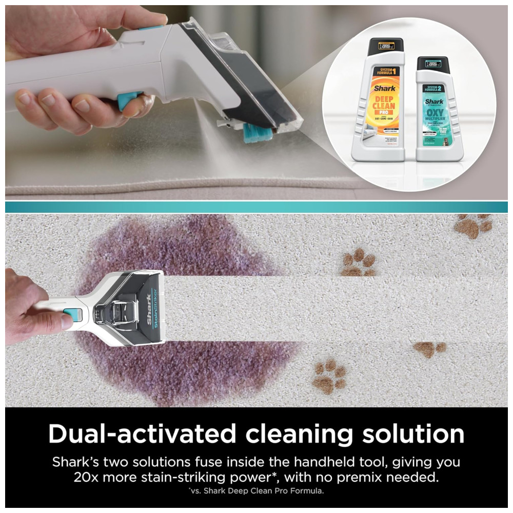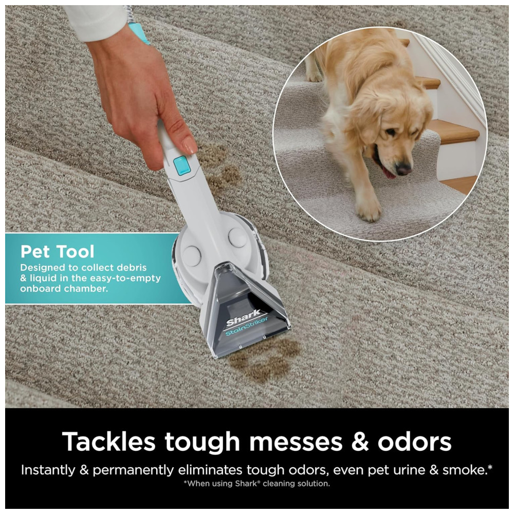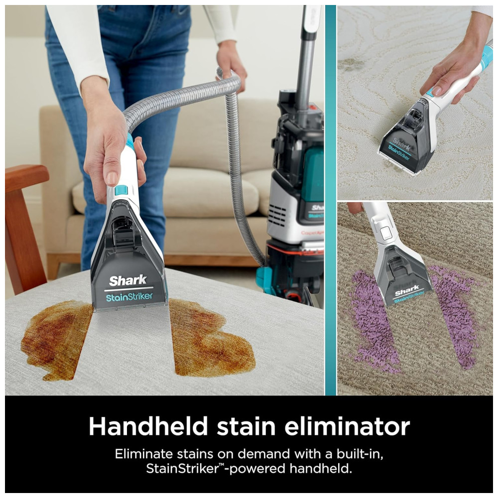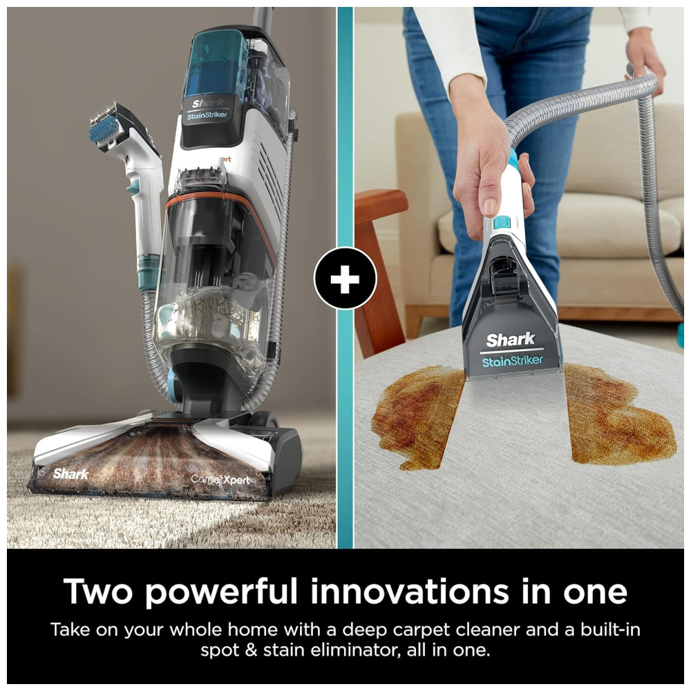 O Shark CarpetXpert com Stainstriker é um limpador profundo de carpetes 2 em 1 e eliminador portátil de manchas que combina o spray de alta pressão PowerWashTM de sucção mais forte da Shark para fornecer a melhor limpeza profunda de carpetes e a melhor eliminação de manchas difíceis do mercado. Com dois produtos de limpeza exclusivos que se misturam e são ativados por contato na ferramenta integrada, ele fornece 20X mais poder de remoção de manchas e eliminação instantânea de odores.