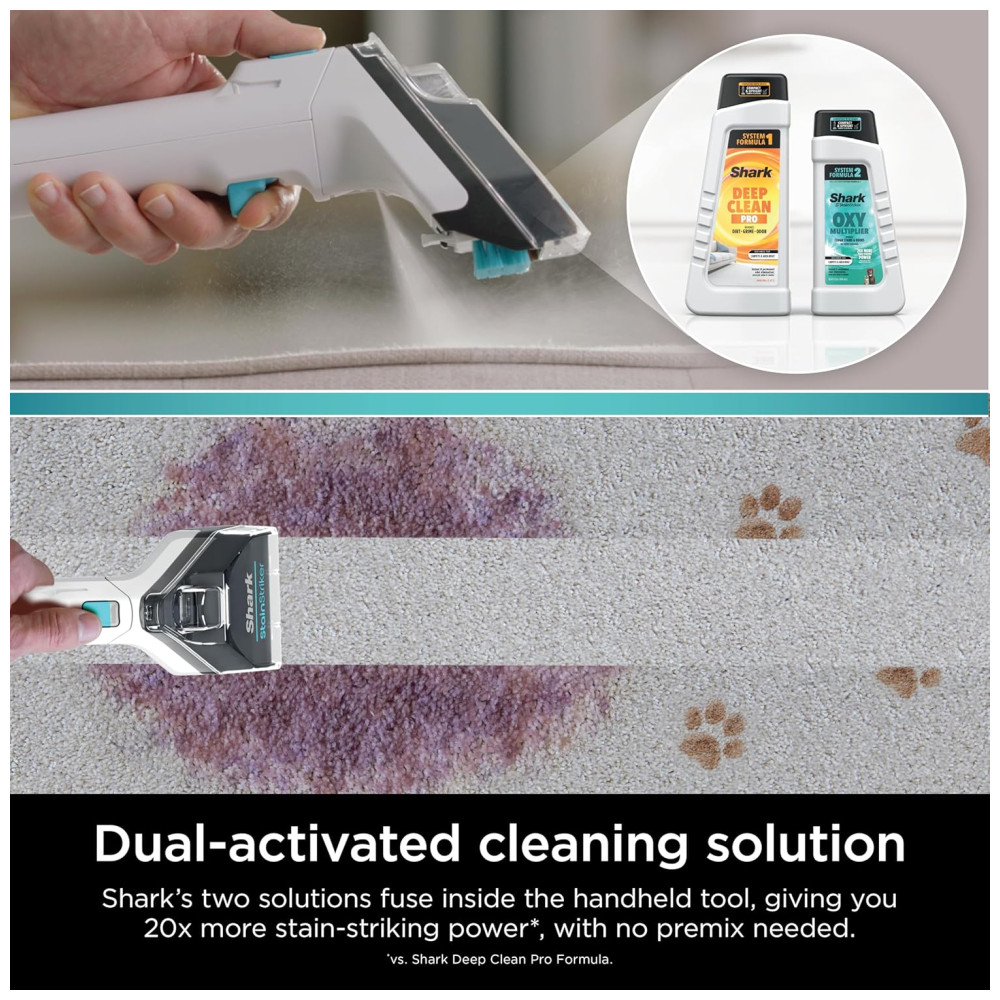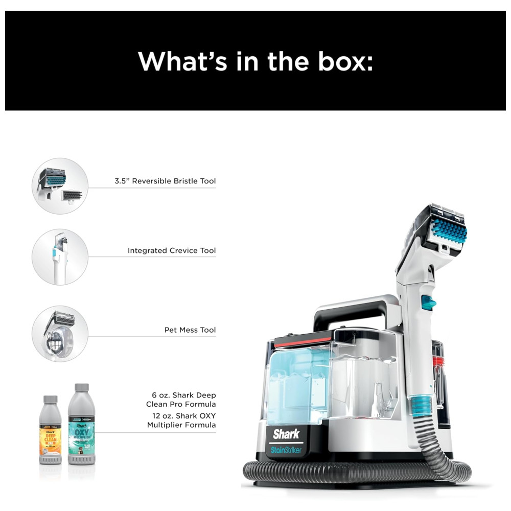 O QUE ESTÁ INCLUÍDO: Shark StainStriker, ferramenta para fendas integrada, 8,89 cm ferramenta de cerdas reversíveis, ferramenta para animais de estimação, ferramenta para limpeza de mangueira, fórmula Deep Clean Pro de 177,44 ml, fórmula multiplicadora OXY de 354,88 ml.