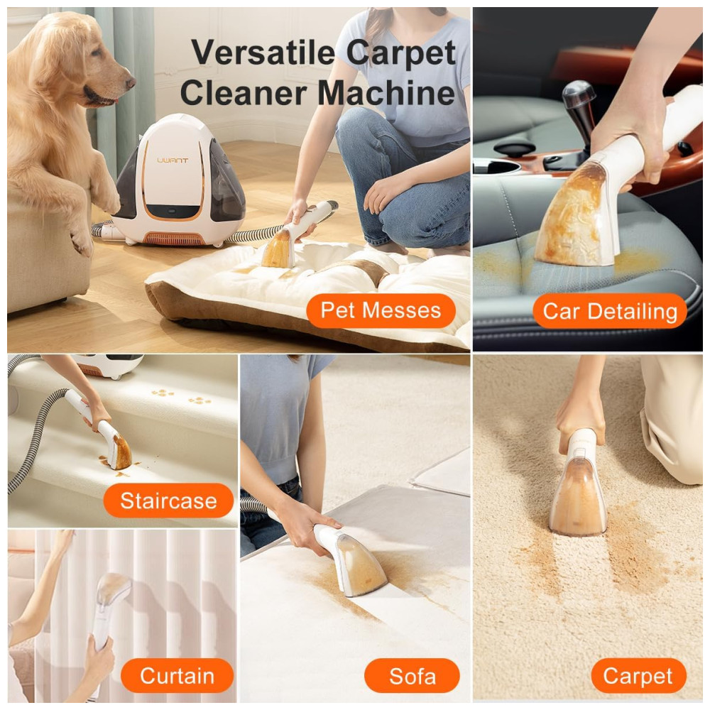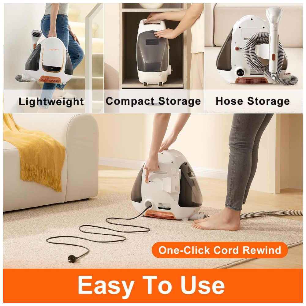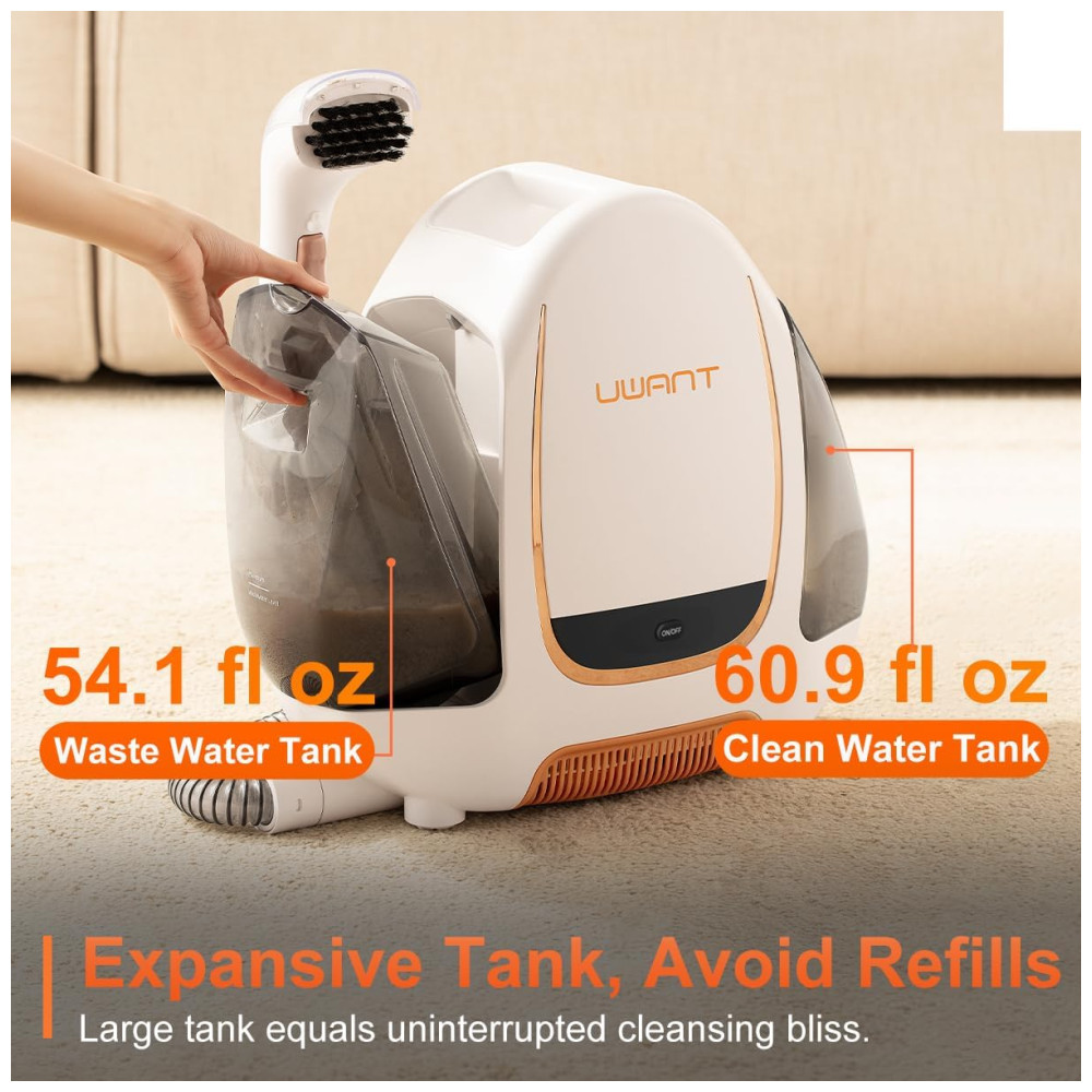 Remova manchas com facilidade usando o poderoso limpador de carpetes de carro da UWANT, que apresenta uma super sucção de 12KPa para eliminar acidentes em carpetes, móveis e interiores de automóveis. Com o recurso de autolimpeza conveniente OneButton SelfCleaning, a pós-limpeza é fácil, sem a necessidade de desmontagem ou ferramentas extras. Este limpador portátil é perfeito para limpar tapetes, sofás, cortinas, escadas e interiores de carros, bem como para combater manchas e odores persistentes de animais de estimação. Com um design leve e rodas giratórias de 360 graus, é fácil de manobrar e armazenar. O lavador de carpetes possui tanques de água duplos, permitindo uma limpeza ininterrupta e mantendo um ambiente higiênico. A mangueira de 1,6 metros e cabo de alimentação de 4,98 metros permitem limpar manchas em carpetes e muito mais, enquanto a cabeça da escova macia e suave garante a segurança do tecido. Solução de limpeza vendida separadamente.