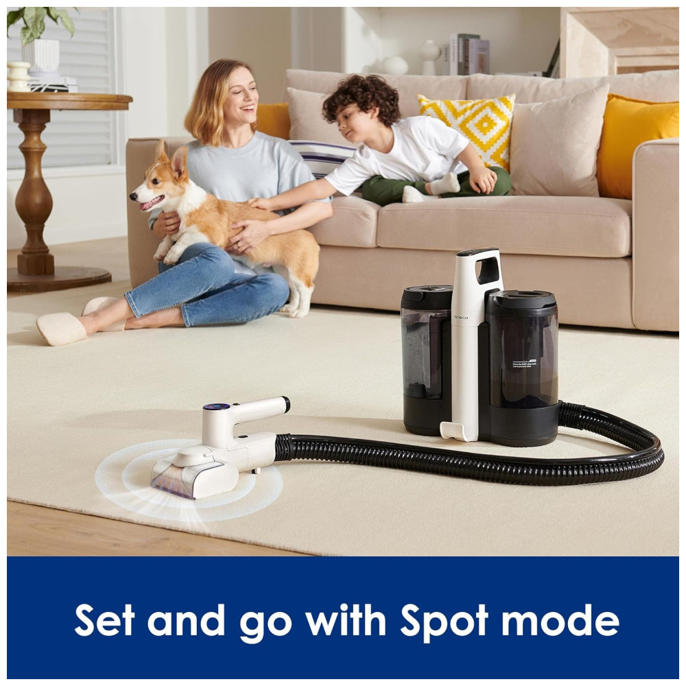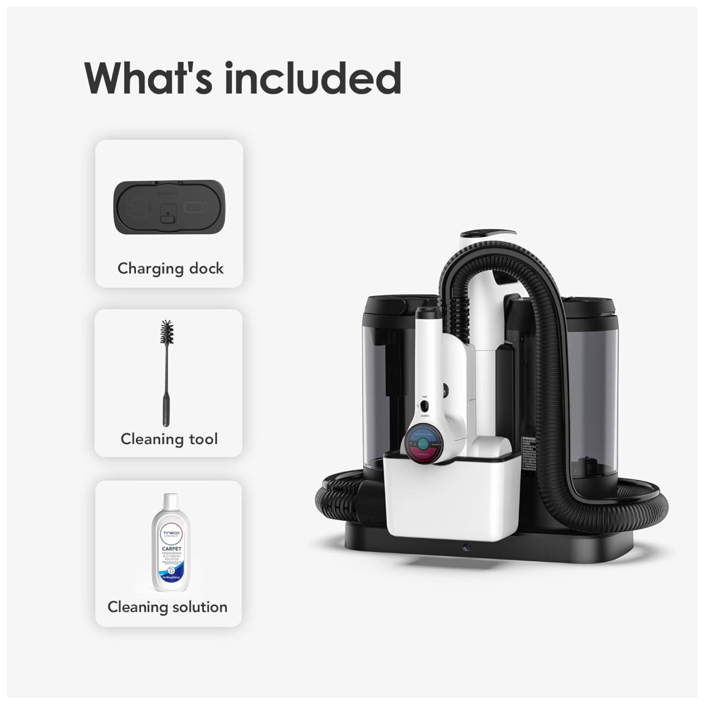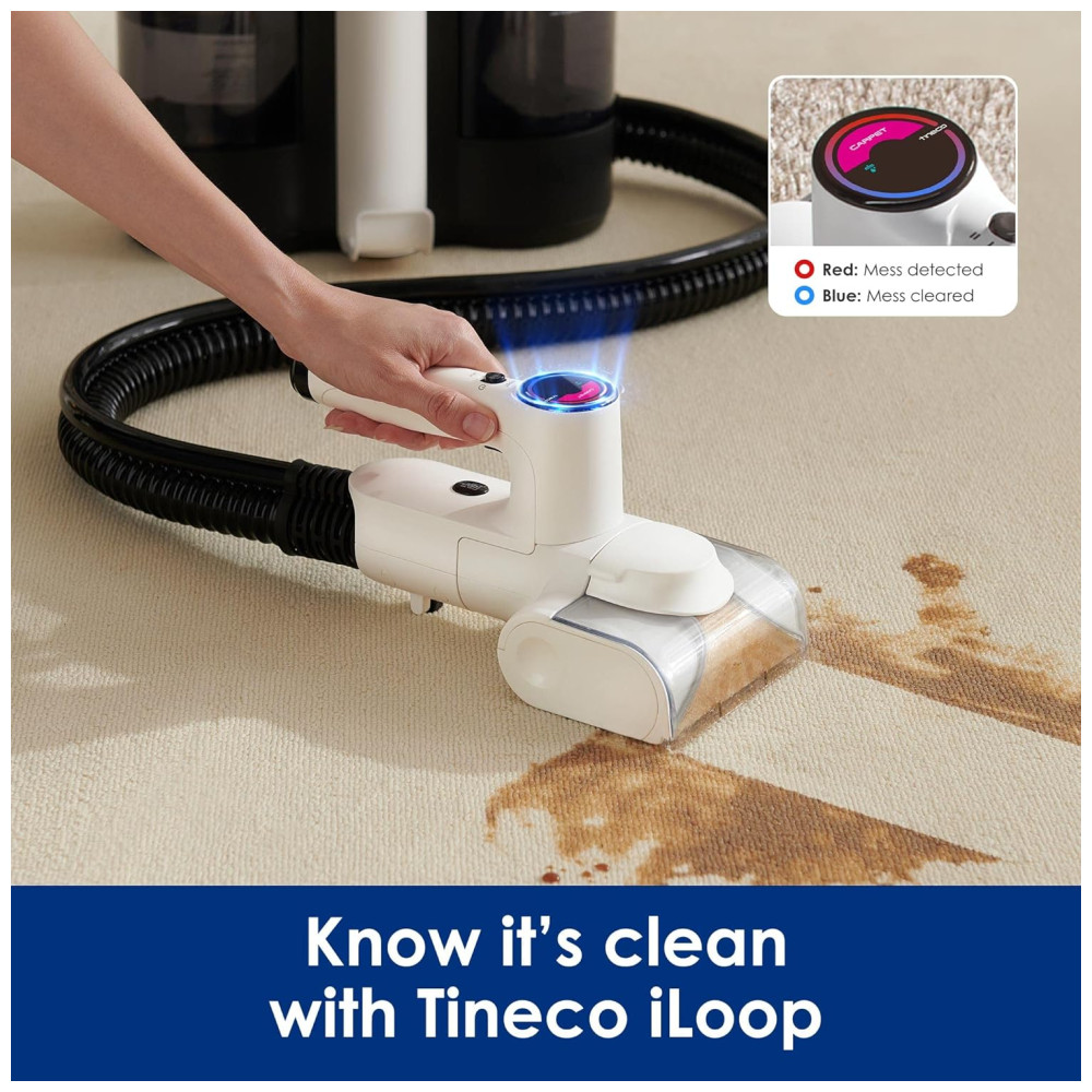 O CARPET ONE é um limpador de manchas com sensor iLoop, motor sem escova e escova motorizada que detecta, esfrega e remove automaticamente manchas difíceis em carpetes e estofados. Com a tecnologia de sensor inteligente Tineco iLoop, o aparelho ajusta automaticamente a velocidade do rolo e o fluxo de água de acordo com a sujeira detectada, economizando água e tempo.