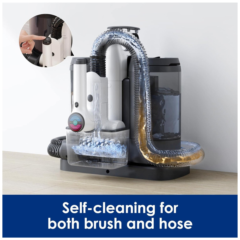 A tela LED e a orientação por voz permitem verificar o status da máquina em tempo real e as notificações de erros. O CARPET ONE possui autolimpeza para fácil manutenção, com a caixa de autolimpeza que lava a escova e a mangueira com água doce para remover sujeira e odores após cada uso. O aparelho tem até 40 minutos de autonomia sem fio, permitindo a limpeza em qualquer lugar sem o incômodo de arrastar um cabo. É ideal para derramamentos de líquidos ou sujeira de animais de estimação em tapetes, escadas, estofados ou interiores de carros. Além disso, sua operação silenciosa com motor sem escova permite limpar silenciosamente até 70 dBA, sem perturbar a sua família e animais de estimação.