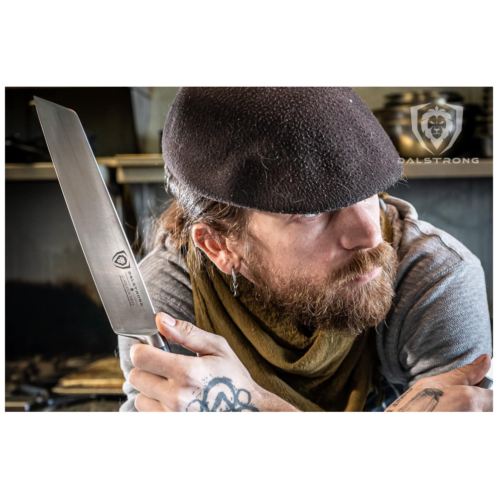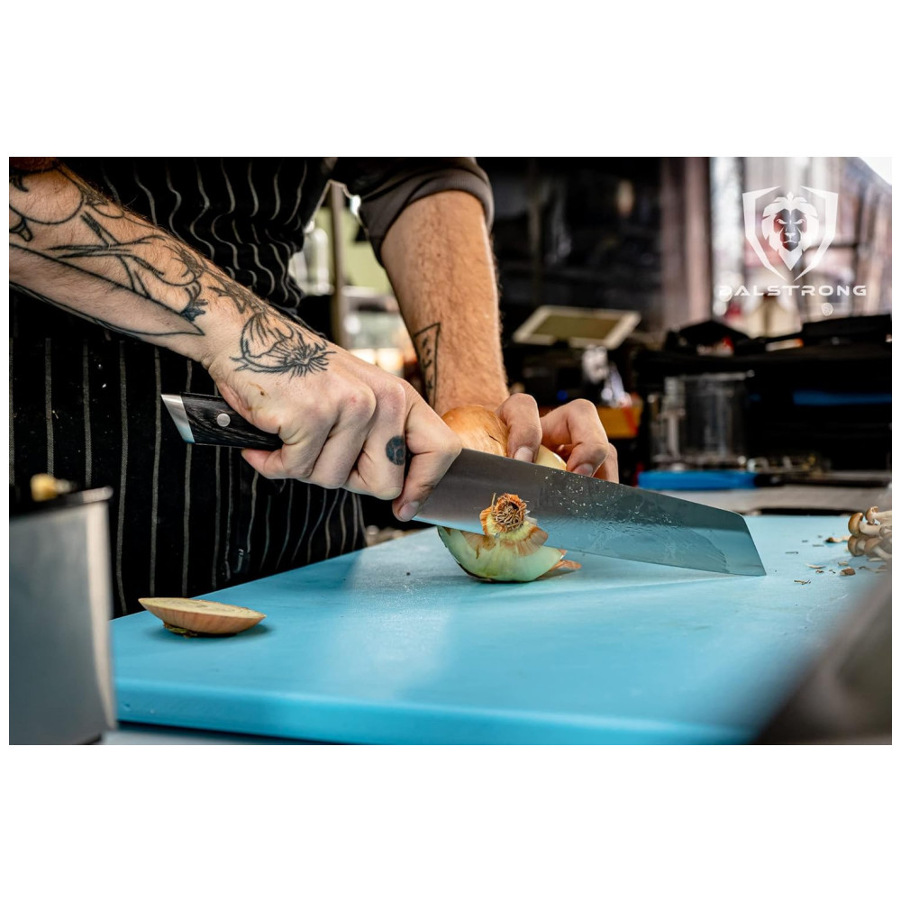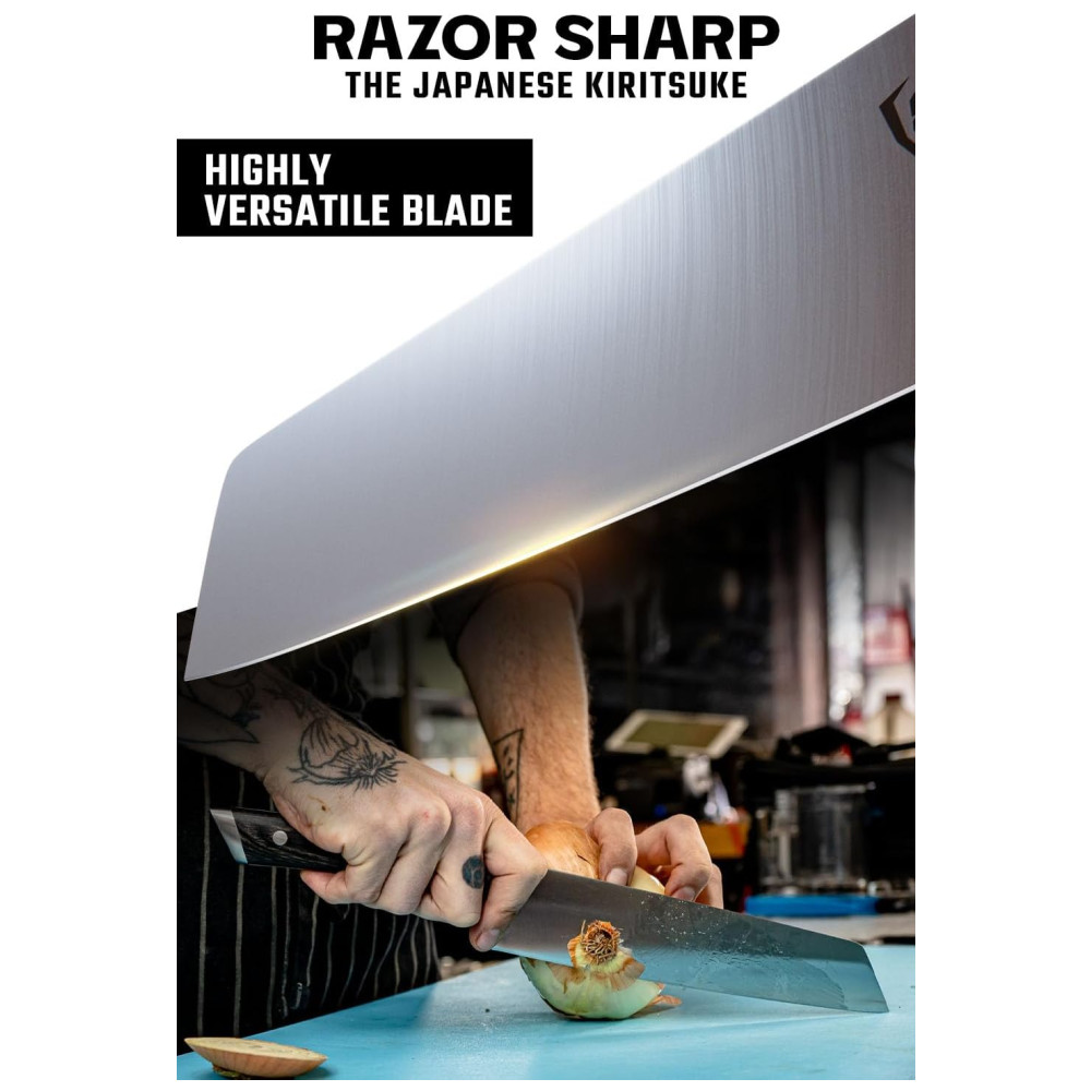 Talheres prontos para a batalha, o kiritsuke de chanfro duplo da Série Gladiador de 8,5 polegadas especialista em corte por pressão e fatiamento. Projetado com uma extremidade frontal em forma de espada, esta lâmina visualmente deslumbrante é um instrumento de alto desempenho com eficácia excepcional