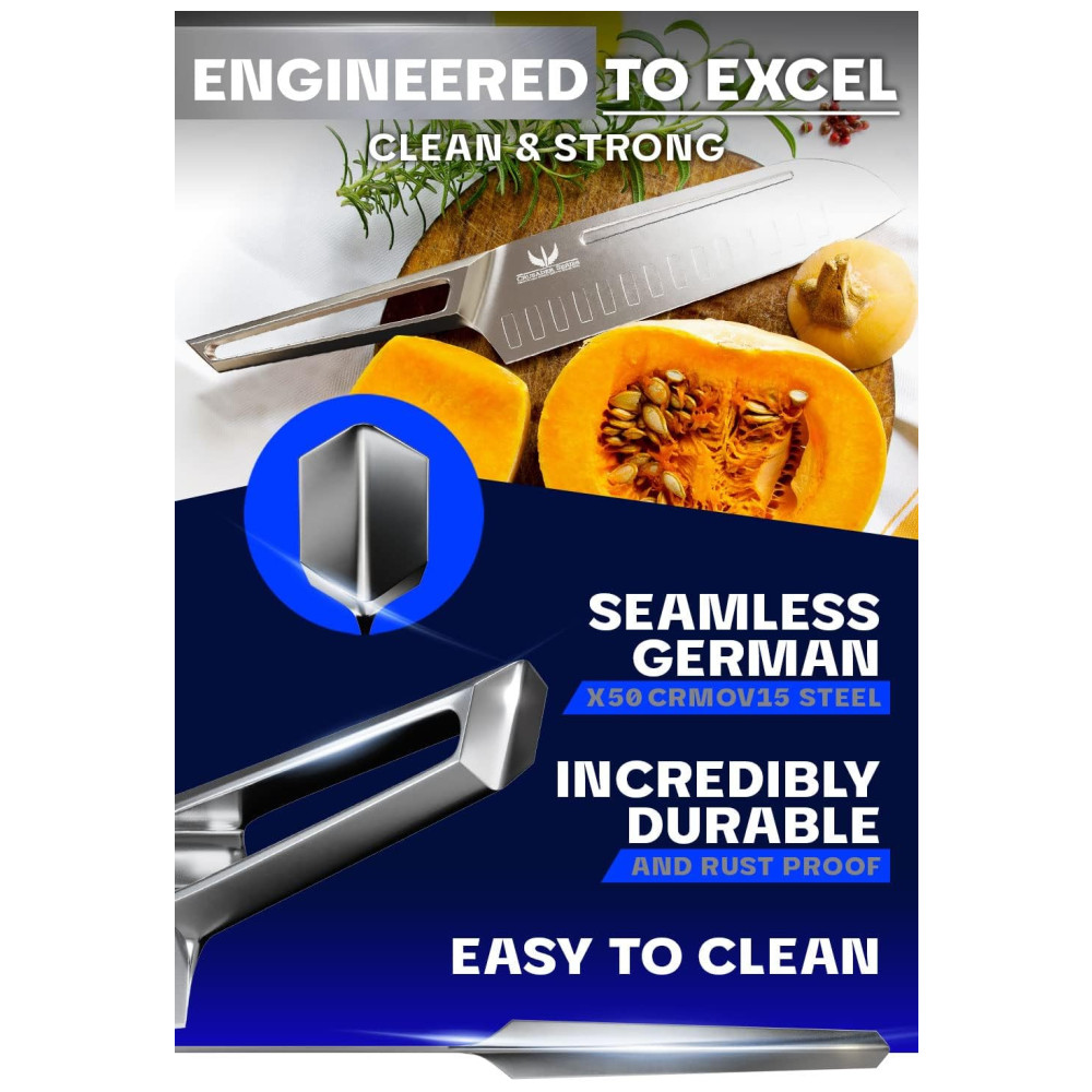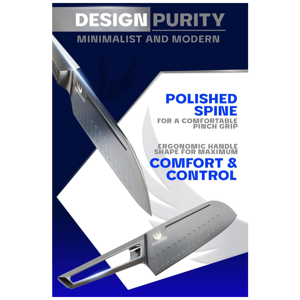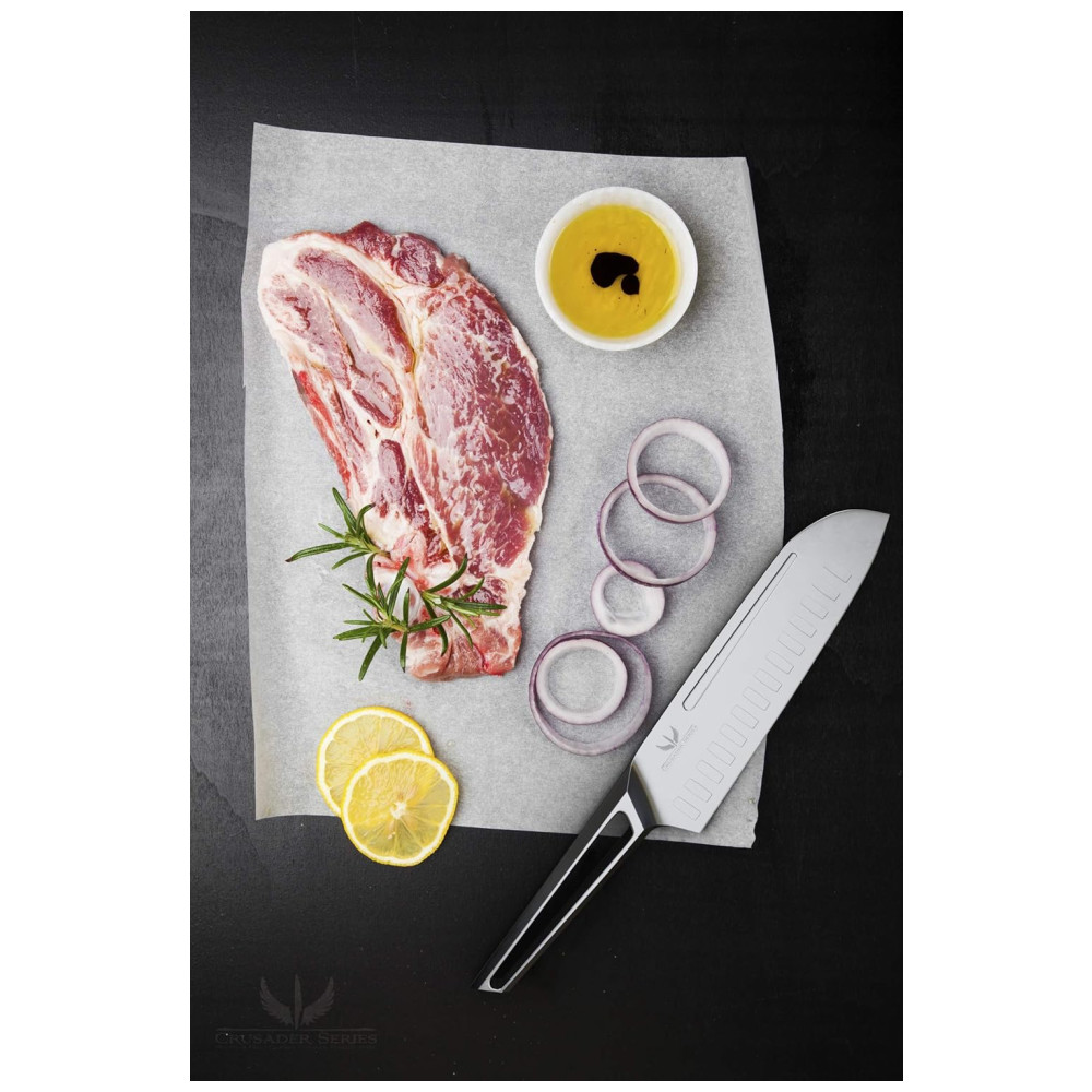 Pureza do projeto. Uma coleção de facas de aço de design impressionante, oferecendo uma estética minimalista com uma beleza discreta. A abordagem menos abrangente ao design desta série garante um emparelhamento perfeito com qualquer decoração, enquanto o aço de lâmina ThyssenKrupp x50crmov15 fabricado na Alemanha de forma nítida na 58 Rockwell oferece desempenho excepcional. Mão afiada cuidadosamente a 16 18 graus por lado, mantendo o equilíbrio perfeito entre o corte ultrafino e a máxima resiliência. Uma única peça de aço afiado. Uma transição suave e uniforme da lâmina para uma alça de aço inoxidável de alto cromo caracteriza as facas com uma postura agressiva e avançada. As linhas bem desenhadas que formam o perfil de cada faca são indicativas do design moderno, enquanto o sulco mais cheio usinado em cada lâmina é uma reminiscência de espadas medievais históricas, soldando o passado e o presente juntos. Função e desempenho finais. O sulco estilizado ao longo da faca oferece os benefícios adicionais de reduzir o atrito e ficar preso nos alimentos, além de aliviar sutilmente a faca e melhorar o equilíbrio. Lâmina completa para maior resistência e robustez. Lindamente polido à mão para um acabamento acetinado, com um design cônico para dureza e flexibilidade. Temperado com precisão para resiliência com uma coluna polida para facilitar um aperto de pitada confortável. Incluído é o Dalstrong Scabbard, uma bainha de lâmina artesanal lindamente projetada com ímã gravado para manter a faca firmemente no lugar. Uma maneira inteligente e elegante de proteger suas lâminas e dedos. Como uma versão moderna do cavaleiro medieval, revestido de aço, a faca da Série Crusader é uma ferramenta surpreendentemente pura, pronta e esperando para ser seu campeão na batalha culinária
