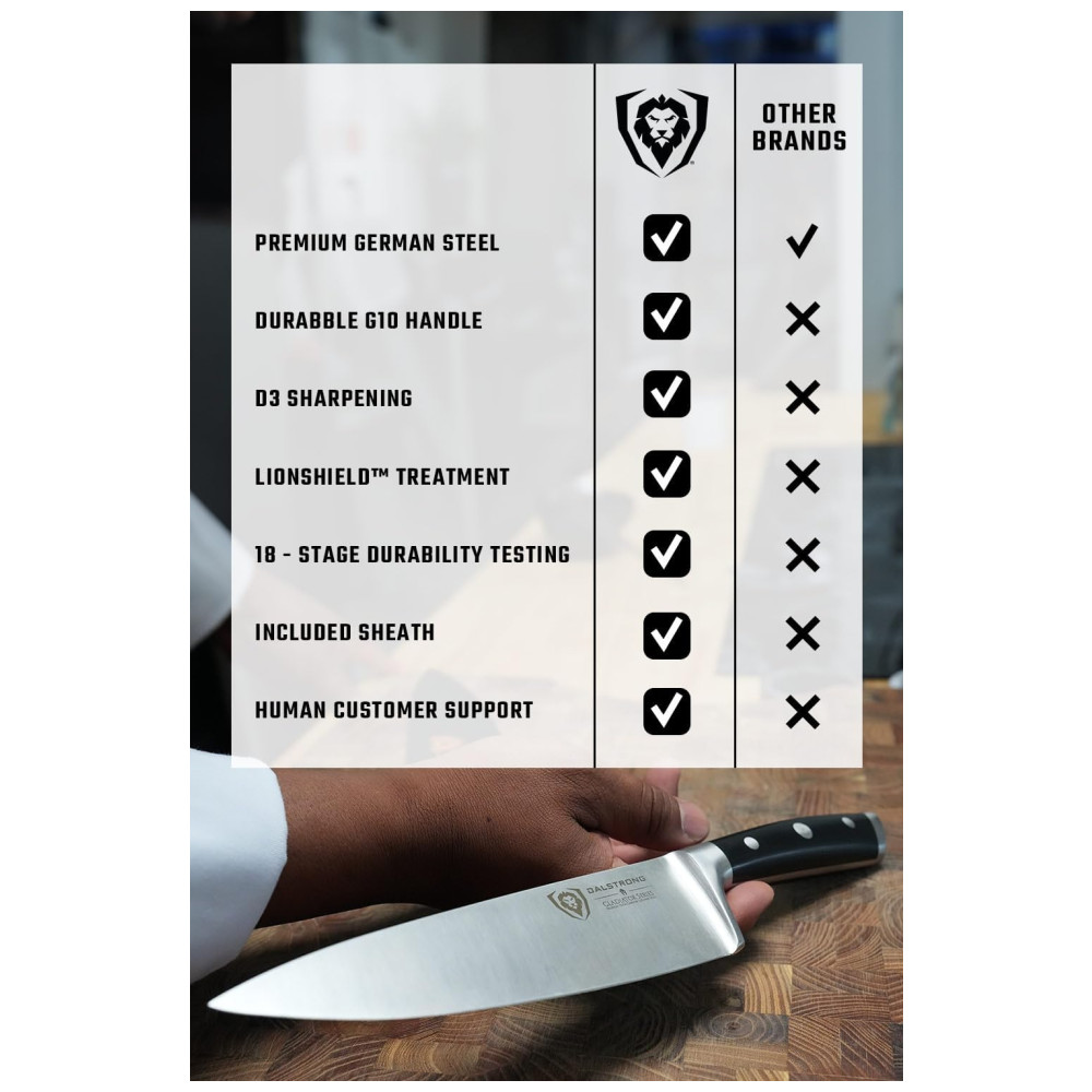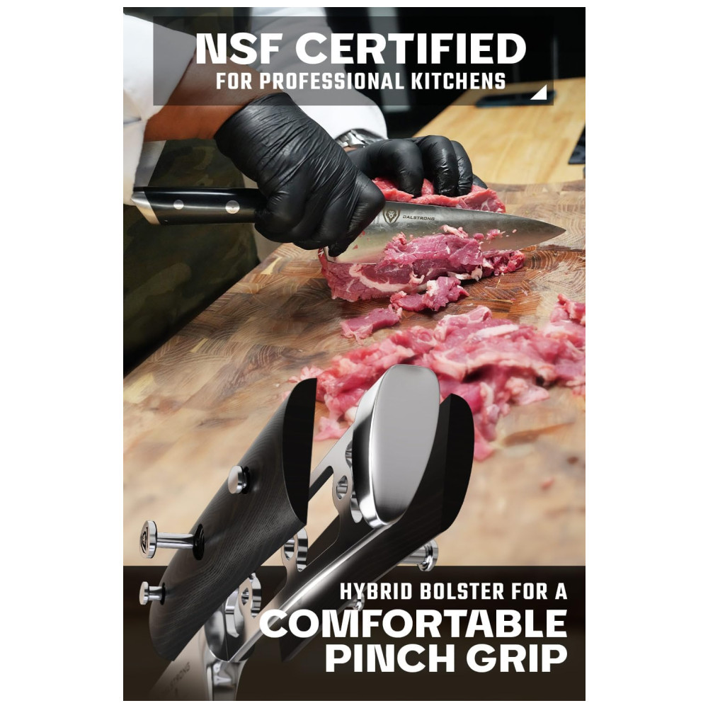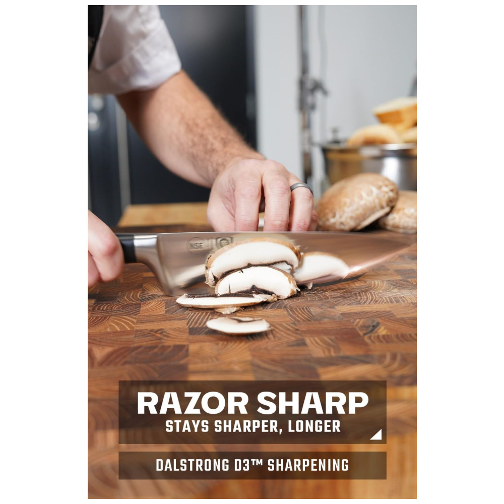 Excelente artesanato, tecnologia de ponta, elementos de design impressionantes e materiais premium. O desempenho máximo nunca foi tão bom a esse preço. Aço alemão de alto carbono importado, incrivelmente nítido e com nitidez nítida, com uma borda polida à mão de 14 a 16 graus por lado. Temperado com precisão e resistente a manchas. Design premiado, com peso satisfatório, materiais premium e sensação de qualidade. A alça de pakkawood preta importada de luxo tem três rebites com uma alça que garante conforto e manobrabilidade. Laminado e polido para uma construção sanitária, perfeito para cozinhas movimentadas Projetado com perfeição na dureza 56 Rockwell e polido à mão para um acabamento acetinado. Cuidadosamente afunilado para maior dureza, flexibilidade e resistência mínima ao corte. A altura alta da lâmina fornece uma folga útil da junta. Veja por que milhares de chefs profissionais e cozinheiros domésticos amam e confiam na DIFERENÇA DALSTRONG