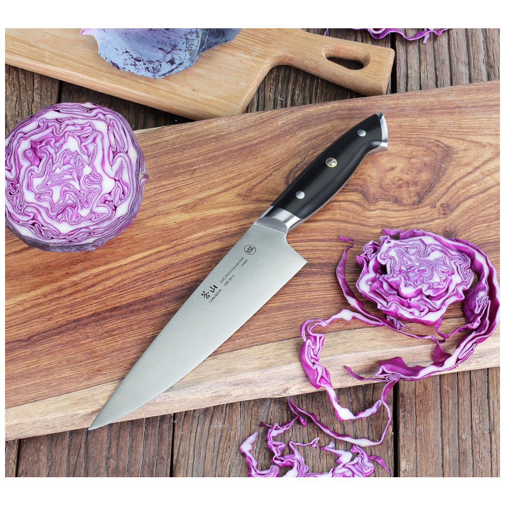 Feito à mão em aço alemão X50Cr15MoV forjado com HRC 58, 2 na escala de durabilidade Rockwell.